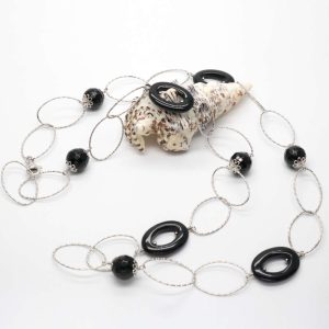 Categoria: collana argento con pietre Lega: argento 925 Peso: 33 gr Lunghezza: 73 cm Pietre: agate nere