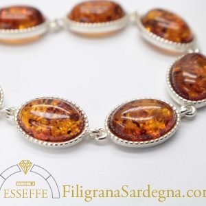 Bracciale con moduli in argento e ambra a cabochon ovali con castone filigranato. Piccole inclusioni all’interno di ogni cabochon di ambra.