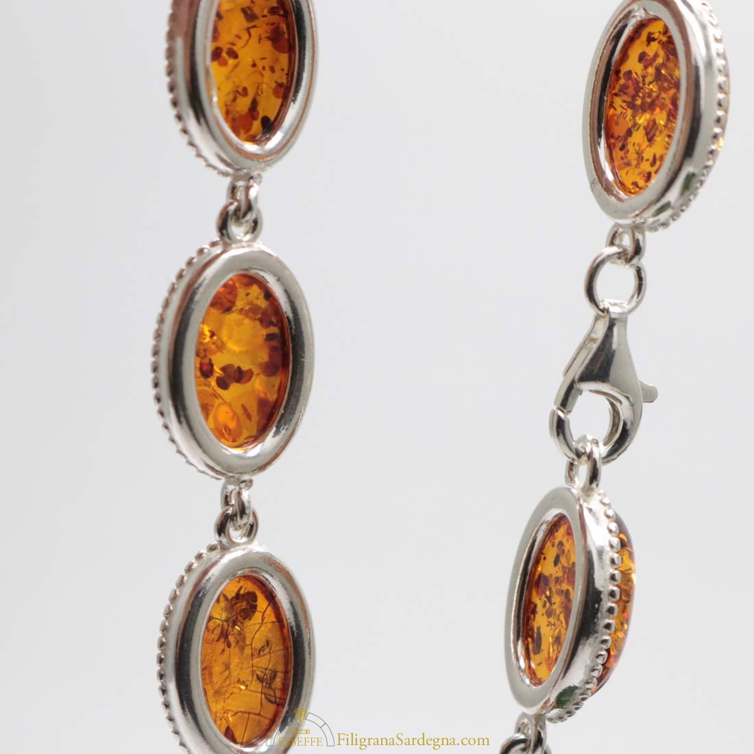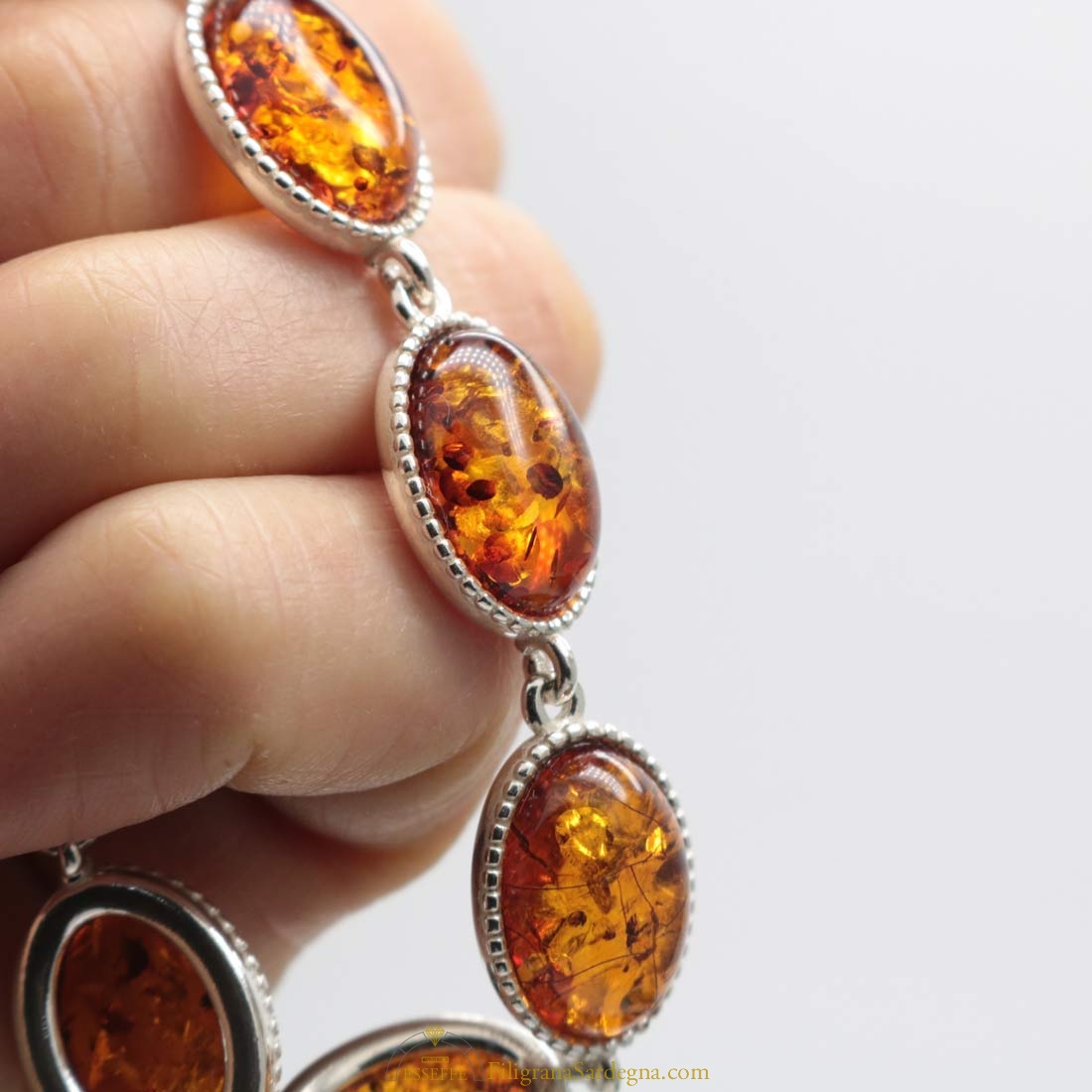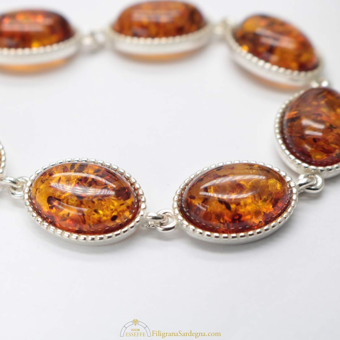Bracciale con moduli in argento e ambra a cabochon ovali con castone filigranato. Piccole inclusioni all’interno di ogni cabochon di ambra.