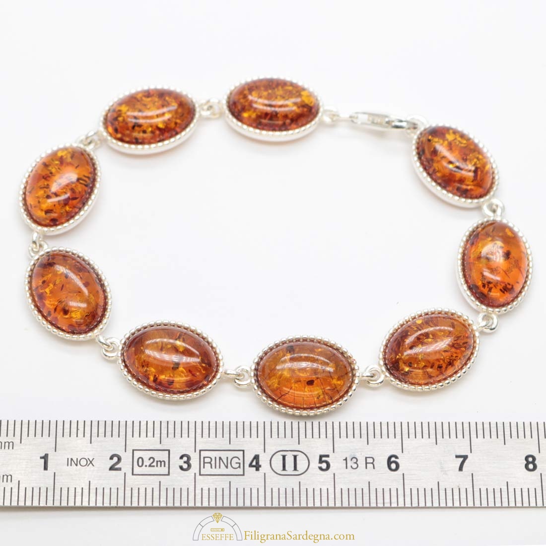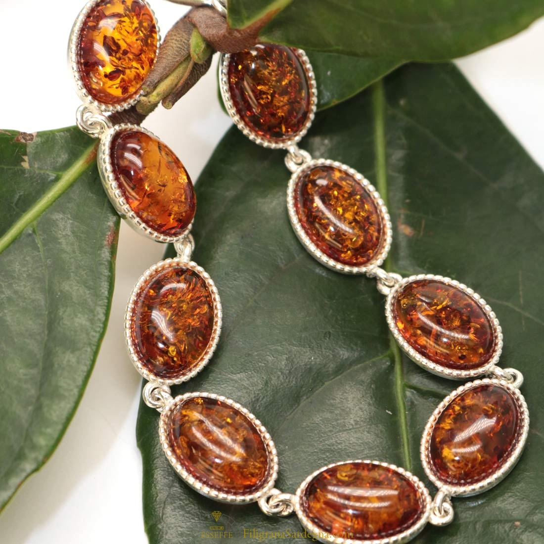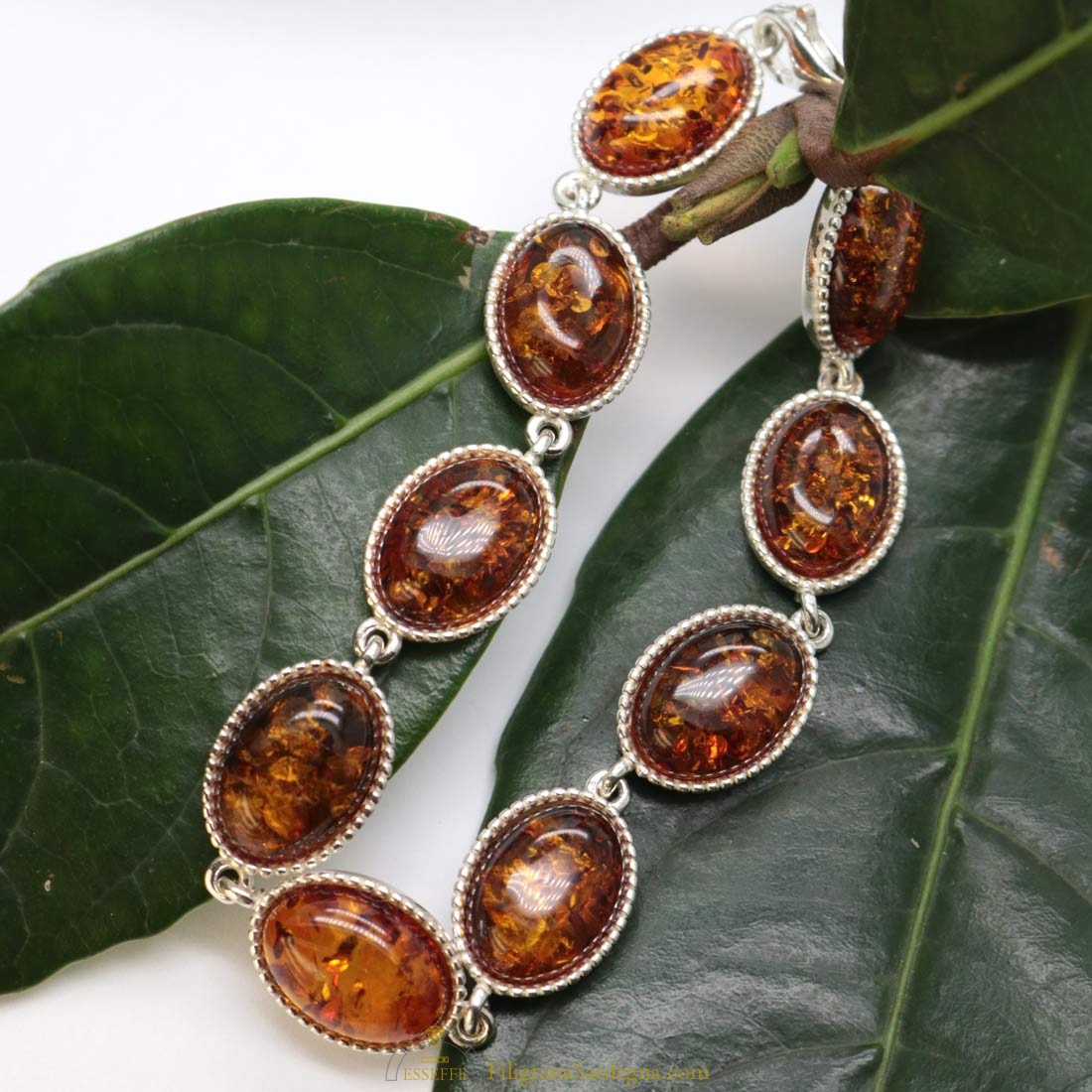 Bracciale con moduli in argento e ambra a cabochon ovali con castone filigranato. Piccole inclusioni all’interno di ogni cabochon di ambra.