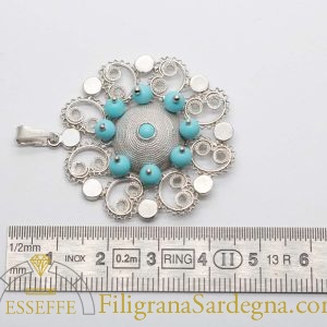 Ciondolo in filigrana d’argento con corbula centrale e sfere di pasta di turchese.
