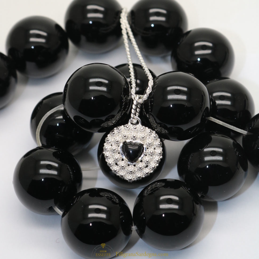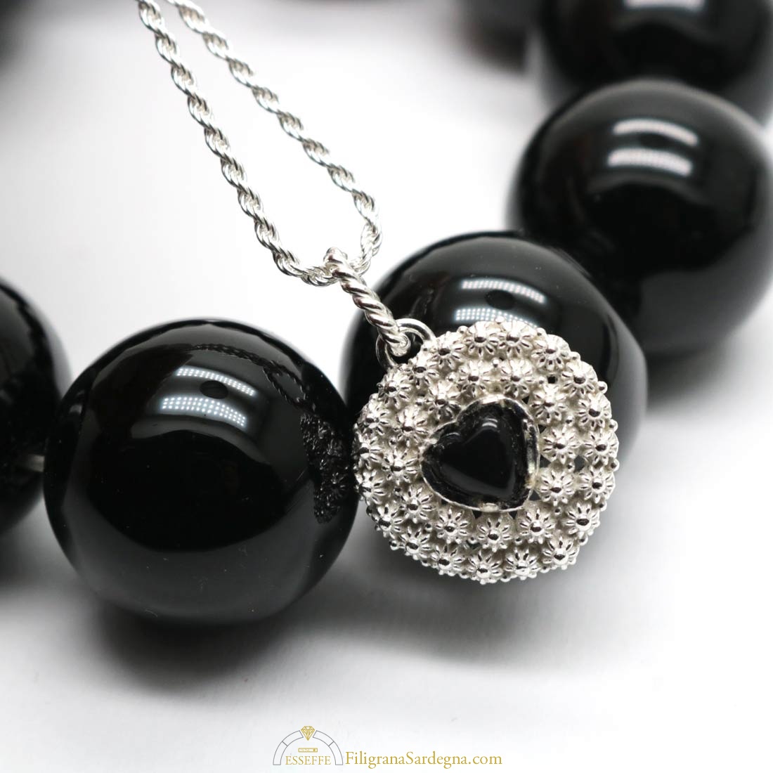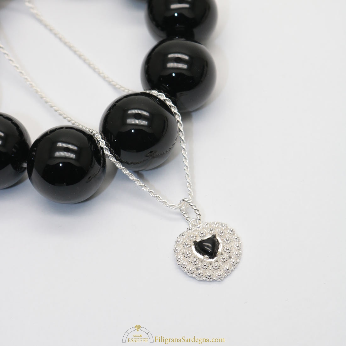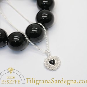 Categoria: ciondolo in filigrana Pietra: onice nera Coppette: argento 925 Collana: laccio nero in caucciù con terminali in argento compreso nel prezzo Scrivete la misura desiderata per il laccio nella nota dell'ordine.