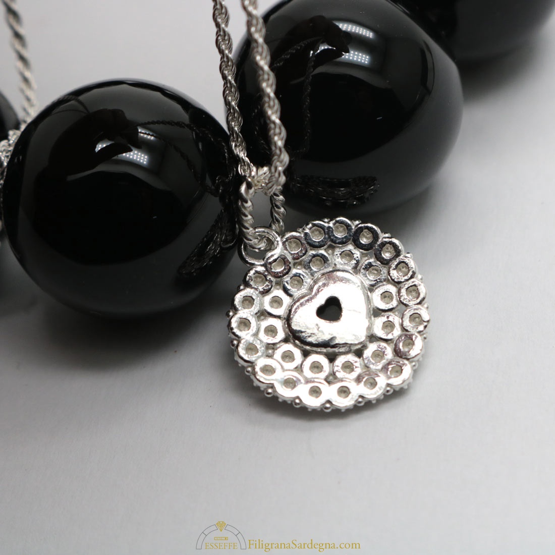 Collana a cordino e ciondolo a nido d’ape con cuore d’onice, tutto in argento bianco naturale.