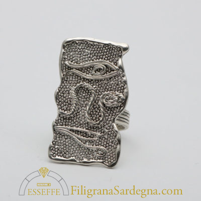 Anello realizzato con la tecnica della granulazione e poi microfusione. Disponibili due varianti, una con spirale, l’altra con simboli e occhio di Osiride.