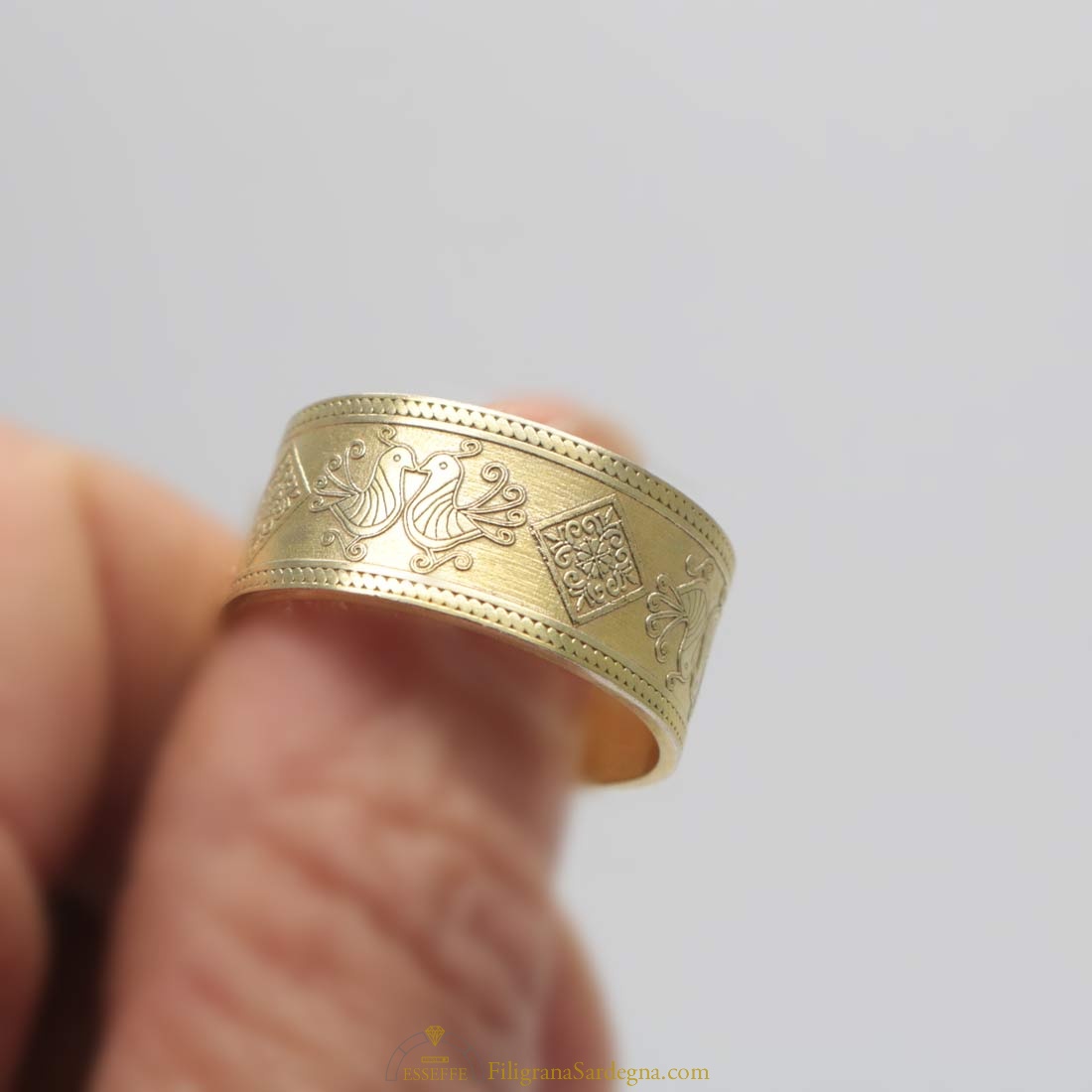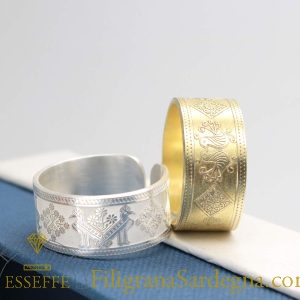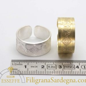 Categoria: fede sarda in filigrana Lega: argento 925 per la base e oro 750 per la filigrana Lavorazione: filigrana Altezza fascia: 0,55 – 0,5 cm