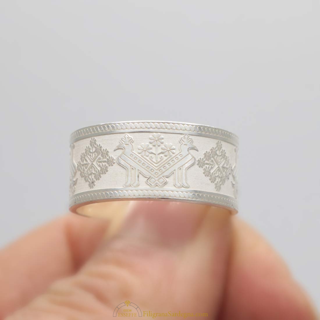 Bellissimo anello in argento bianco naturale o dorato. Nei disegni in rilievo riporta tutto il sapore della tradizione decorativa artigianale della Sardegna.