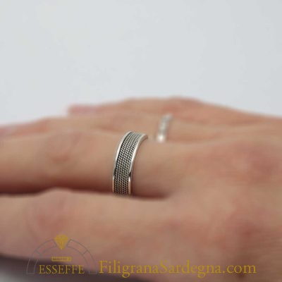 Fede sarda in argento con filigrana avvolta su tutta la circonferenza dell’anello. Nuovo modello, con base più strutturata.