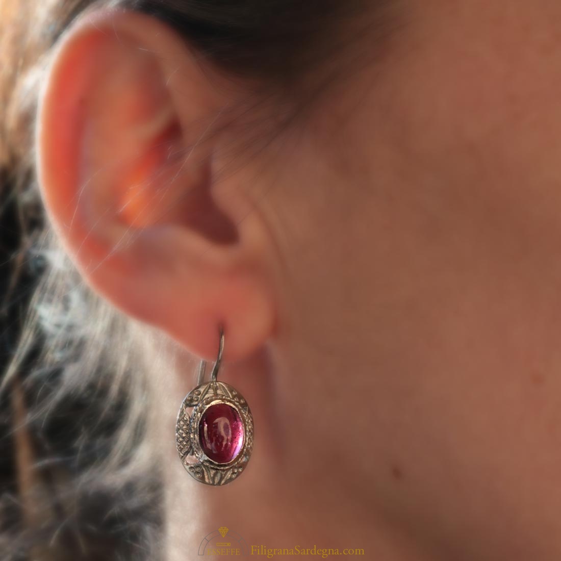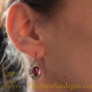 Categoria: orecchini filigrana argento Lega: argento 800 Lavorazione: filigrana a microfusione Dimensione: 1,7 cm circa di diametro Pietre: granato sintetico