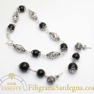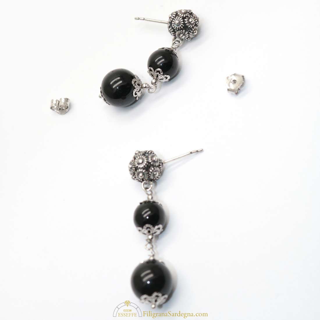 Orecchini pendenti in filigrana d’argento leggermente brunito con due onici pendenti (coccos) e parte a lobo con lavorazione a nido d’ape.