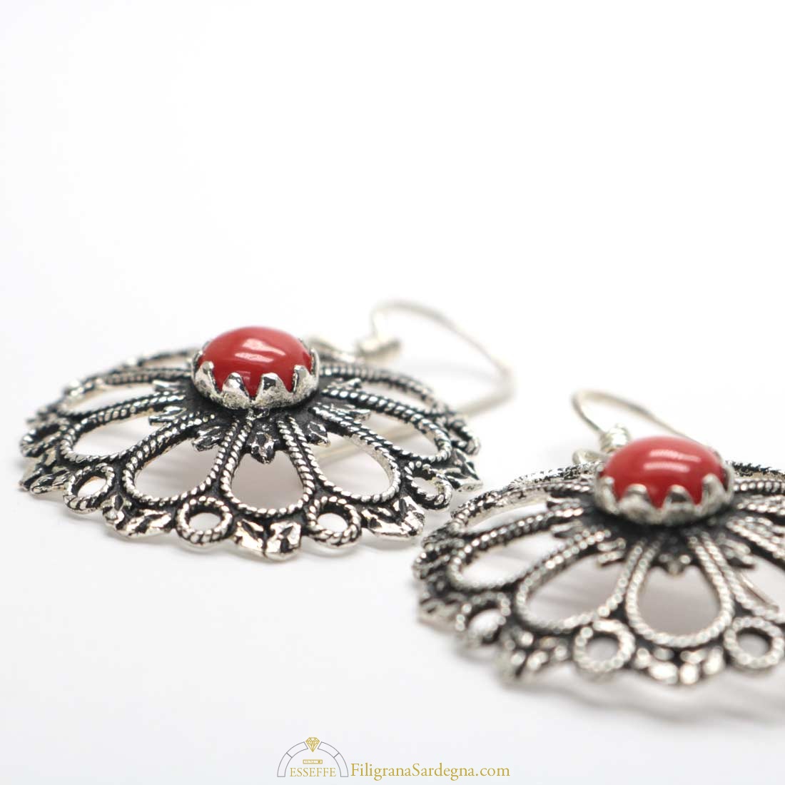 Orecchini pendenti in filigrana d’argento brunito con cabochon di corallo rosso di Sardegna di tonalità intensa.