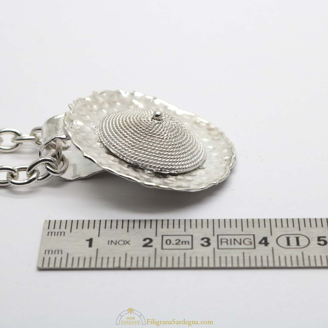 Ciondolo in argento colore naturale, con lastra martellata e corbula saldata al centro. Collana in argento da 60 cm compresa nel prezzo