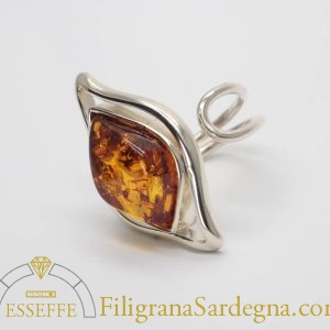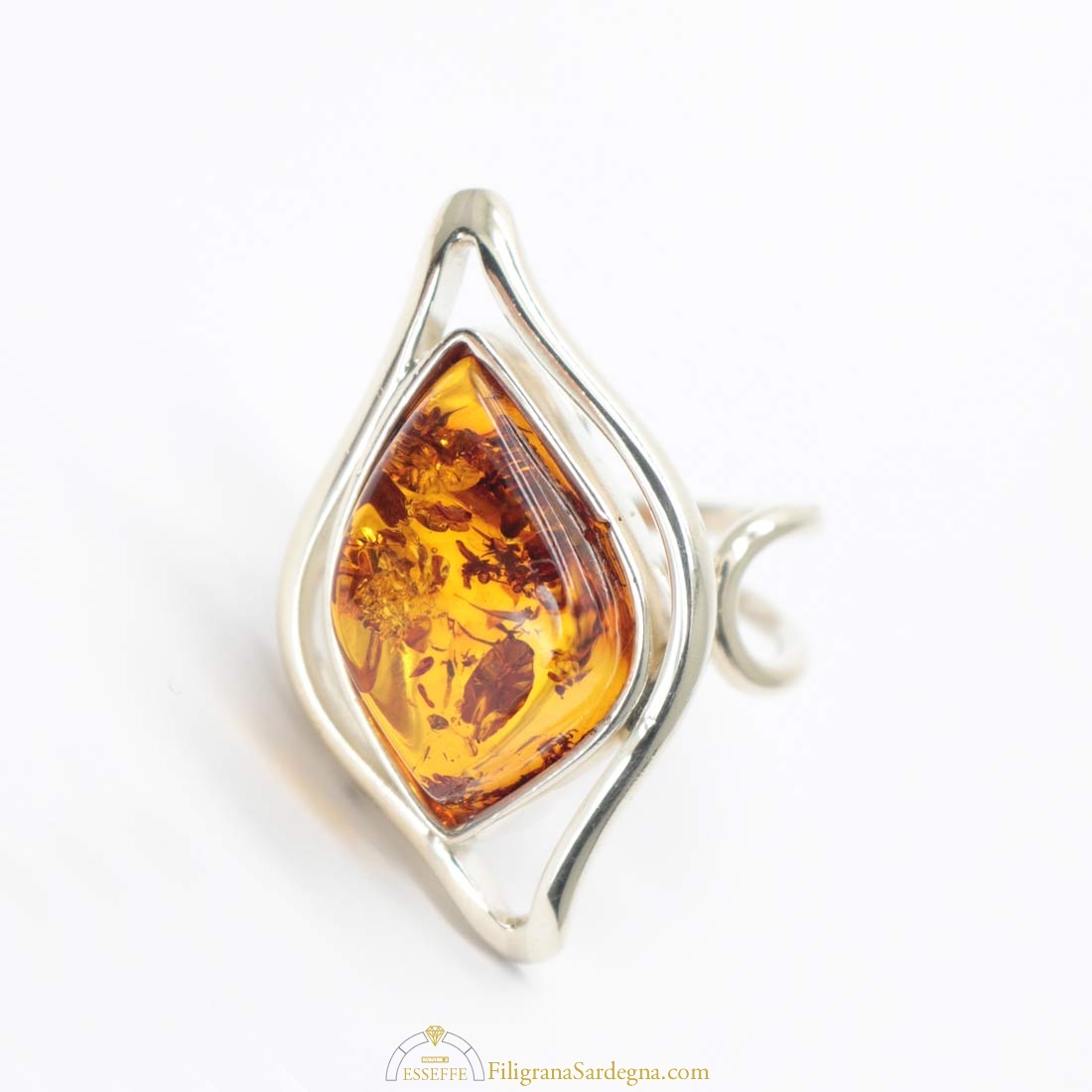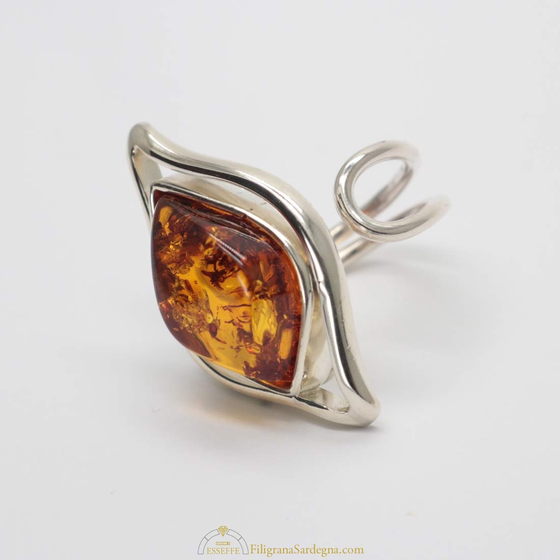 Anello in argento con ambra, il cui disegno somiglia ad un occhio. Il gambo doppio ad abbraccio permette di allargarlo o restringerlo per adattarsi ad ogni misura.