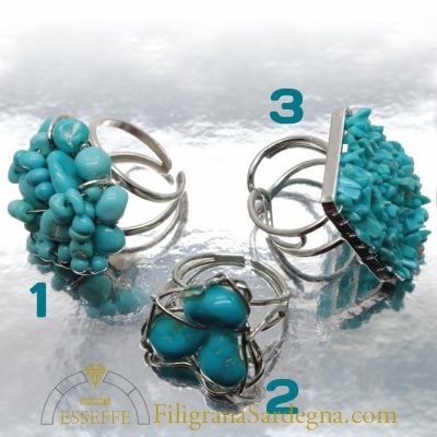 Anello in argento rodiato con sassi di turchese naturale con fili d’argento che li sostengono, tre modelli disponibili.