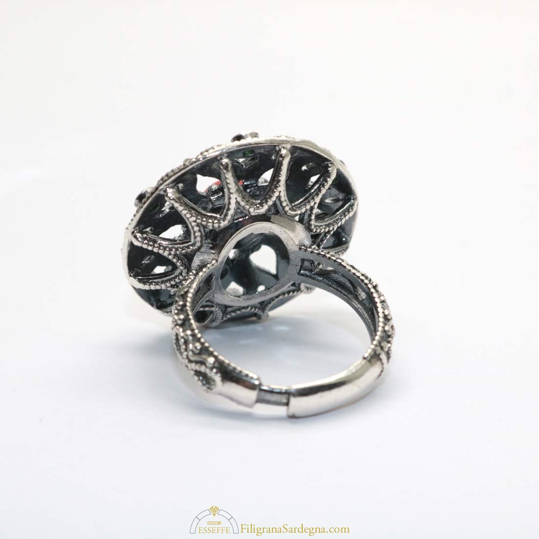 Splendido anello in argento con lavorazione filigranata, cipollina di corallo rosso e smeraldi di sintesi.