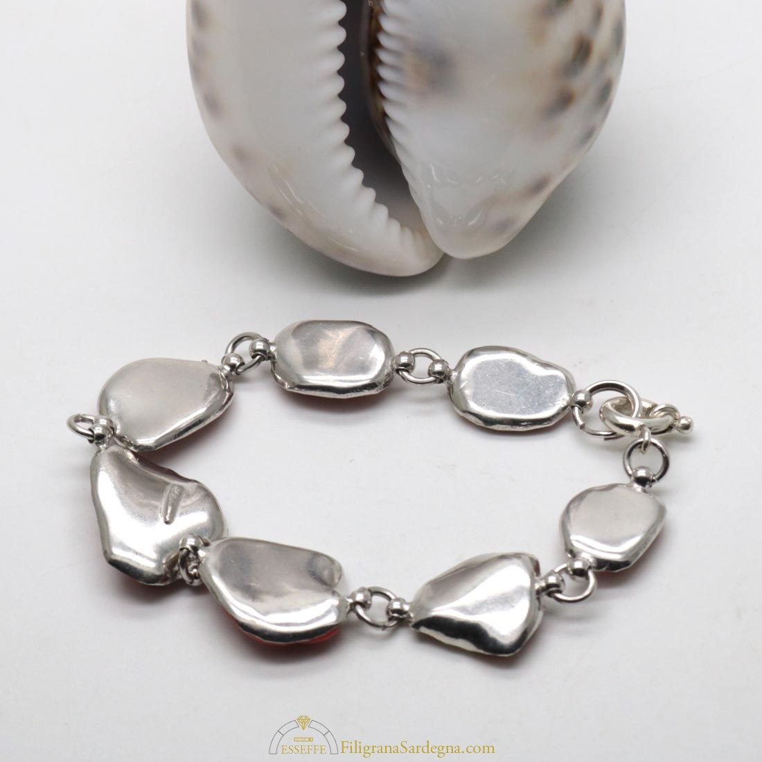 Bracciale in argento rodiato lucido con moduli che racchiudono dei bei sassi di corallo rosso di Sardegna.