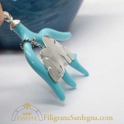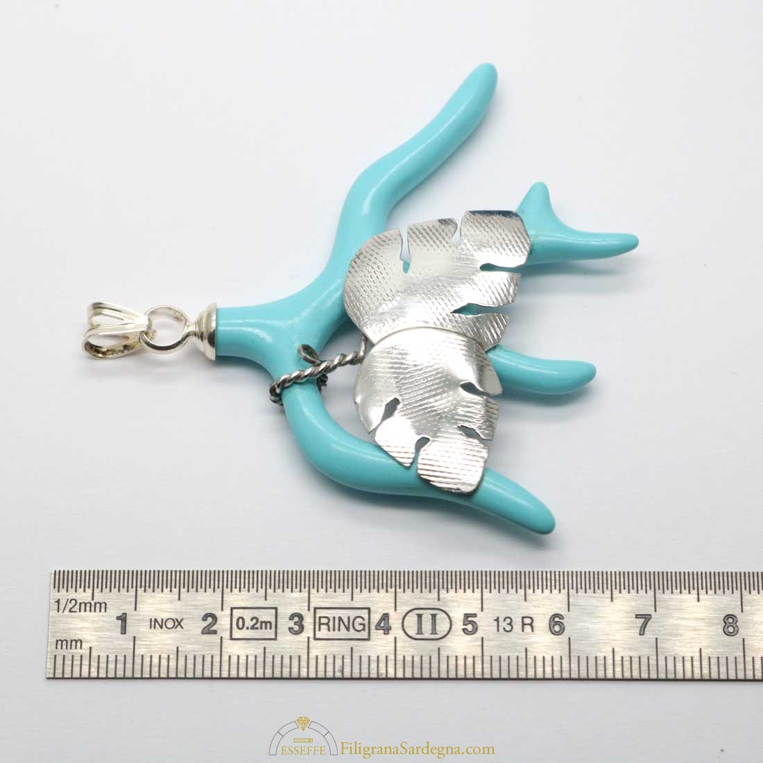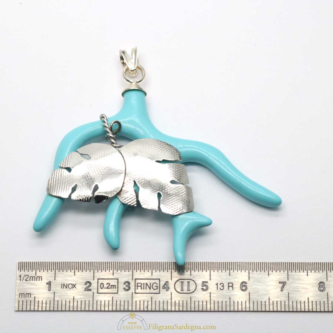Ciondolo in argento con rametto di corallo creato con pasta di turchese, decorato da due foglie di vite in lastra d’argento zigrinata e un viticcio in filo d’argento intrecciato.