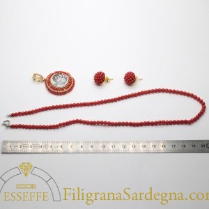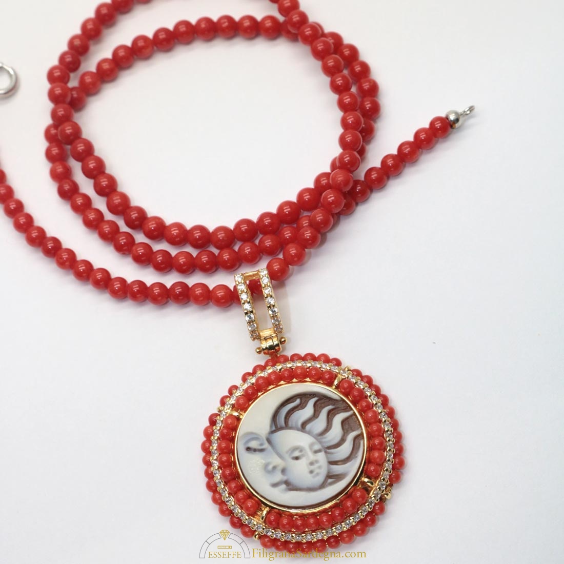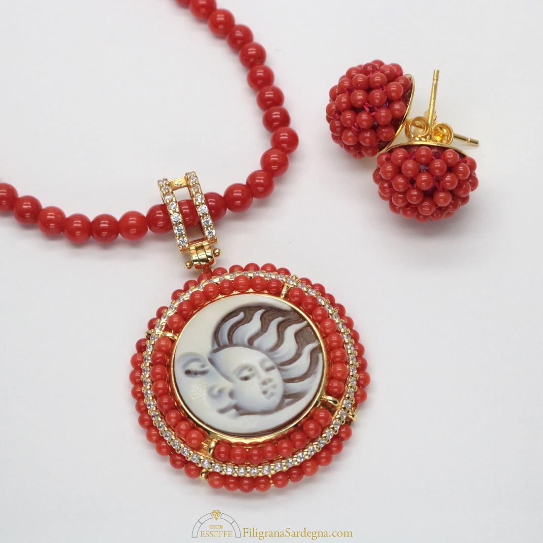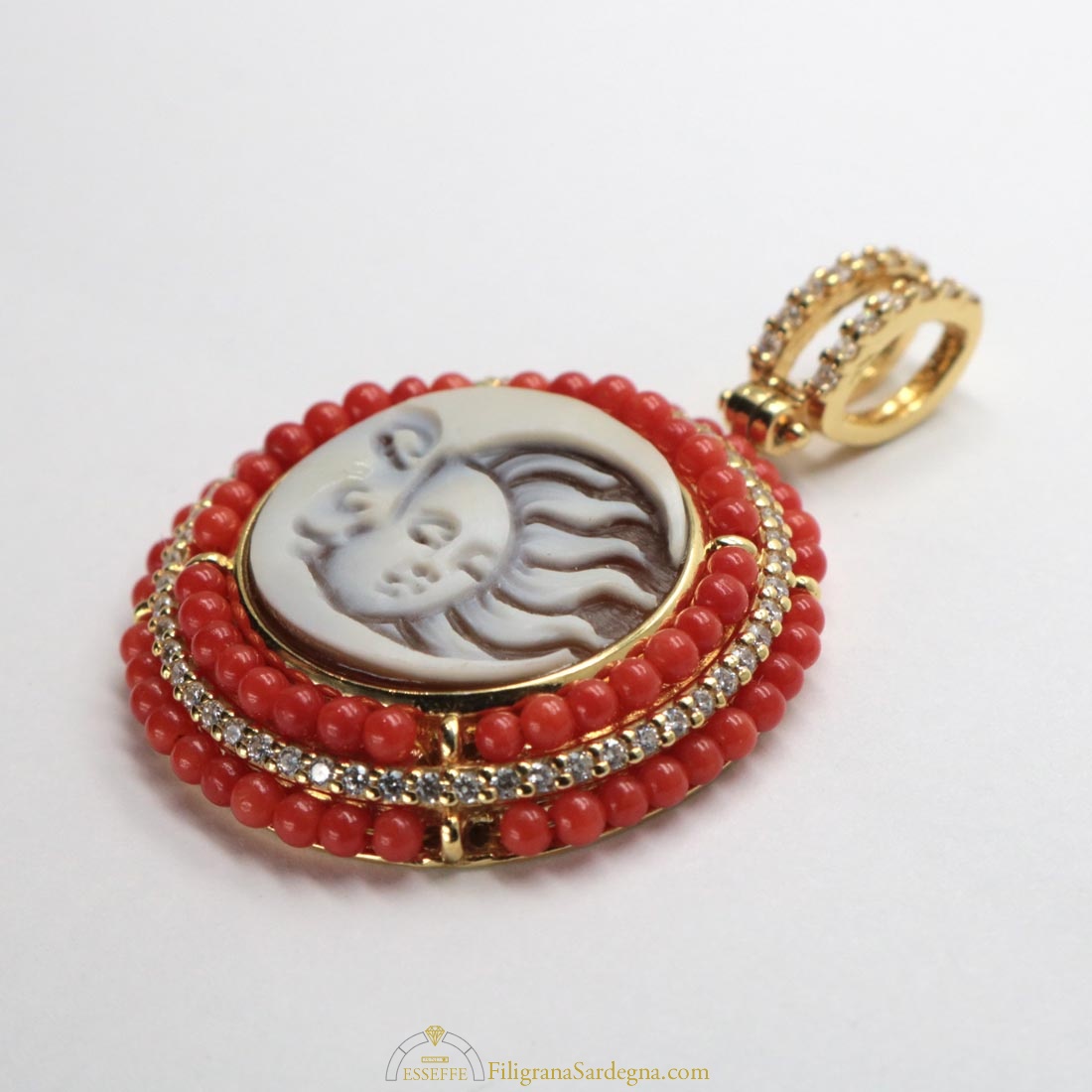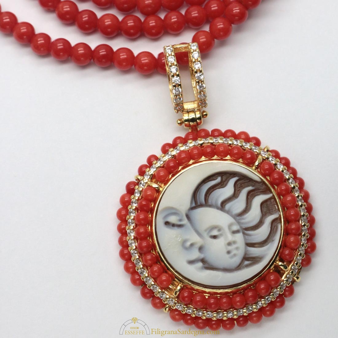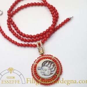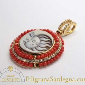 Splendido ciondolo in argento dorato con cammeo raffigurante luna e sole affiancati, contornato da un decoro di piccole sfere di corallo e zirconi. In set con la collana di corallo rosso di Sardegna con sfere da 4,5 mm con sfere di corallo prima scelta e terminali e chiusura in argento rodiato.
