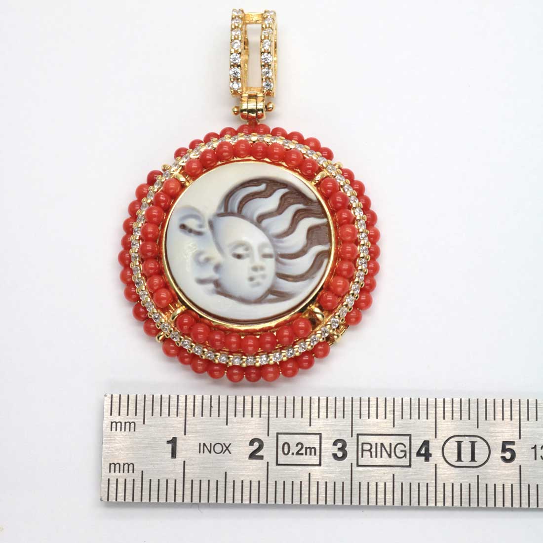 Pietre: cammeo scolpito, corallo, zirconi