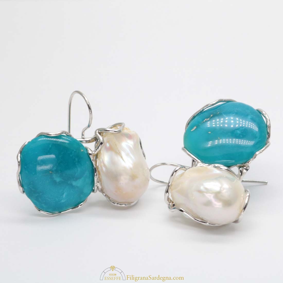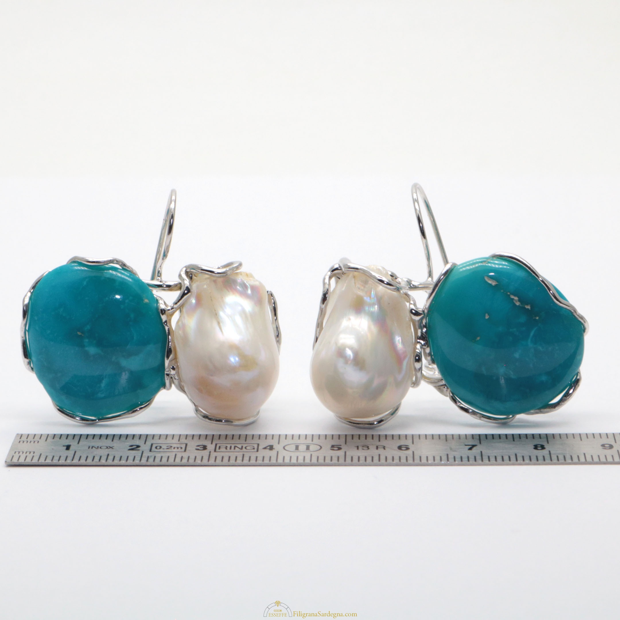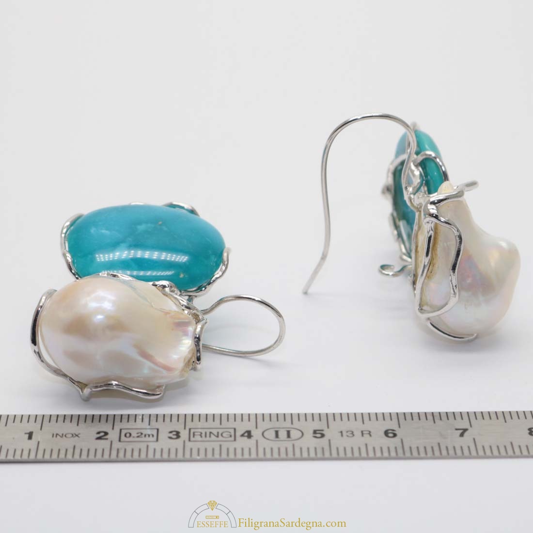 Orecchini d’argento con sasso di turchese naturale e perla barocca