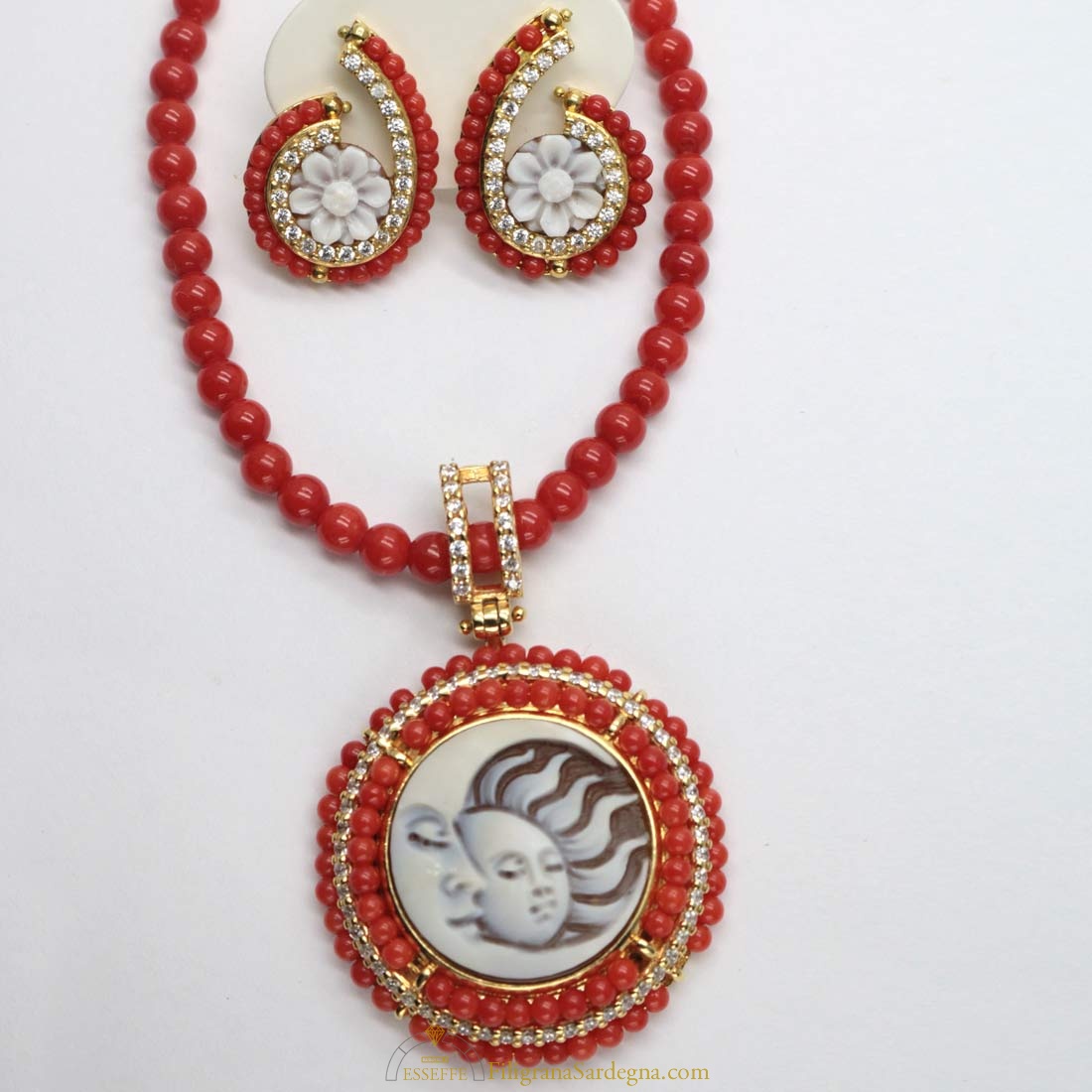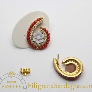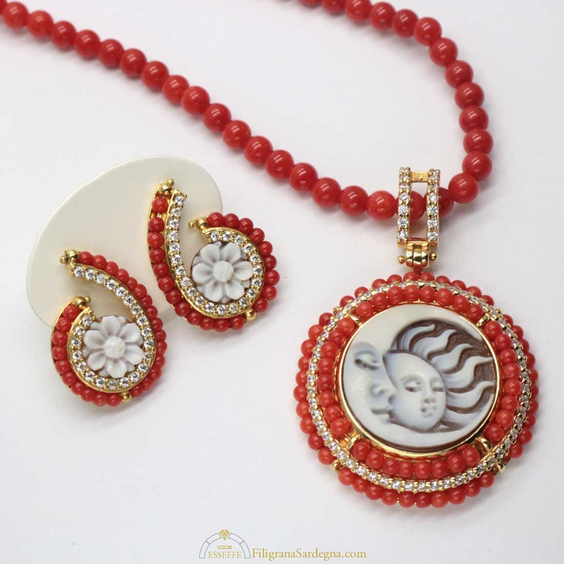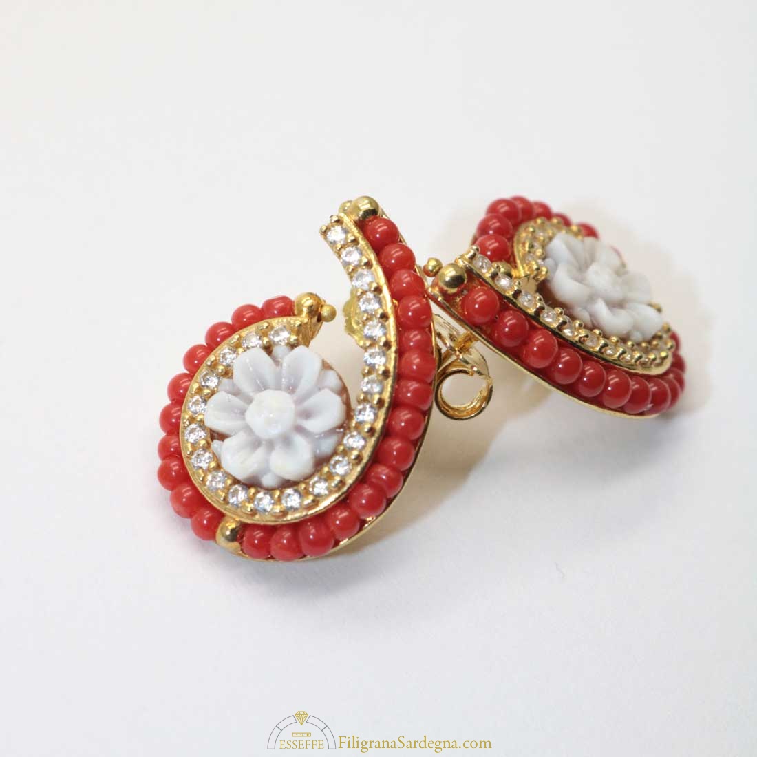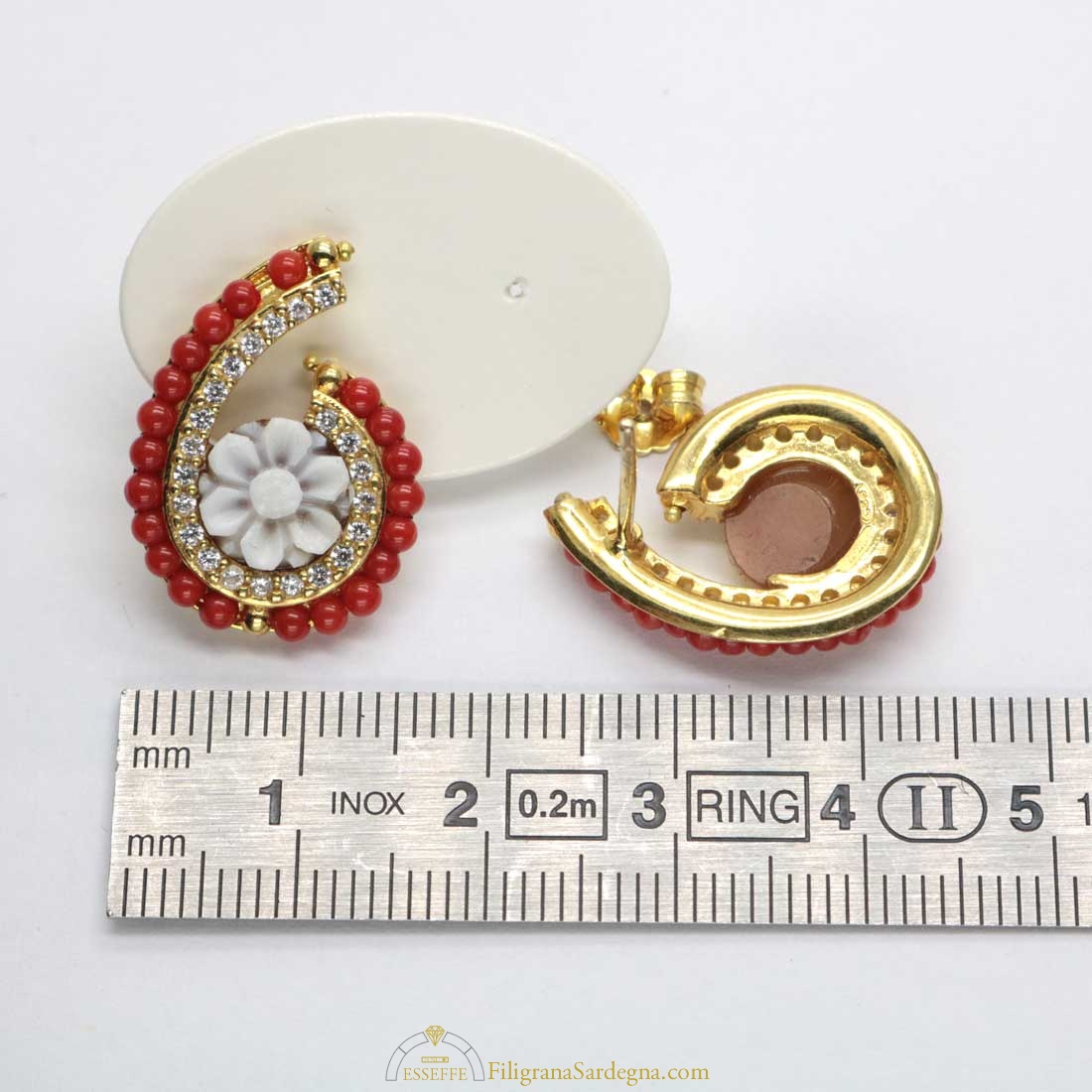 Bellissimi orecchini a lobo, chiocciola in argento dorato con cammeo a fiore, contorno di zirconi e piccole sfere di corallo rosso di Sardegna.