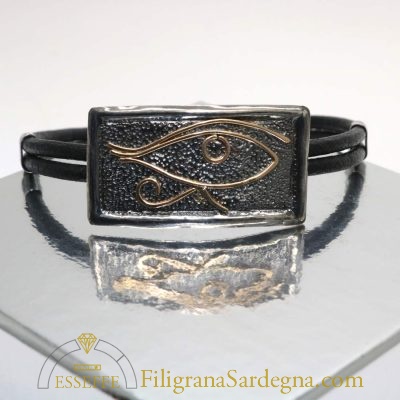 Bracciale in pelle con lastra d’argento brunito lavorata a sbalzo e cesello con occhio di Iside in oro.