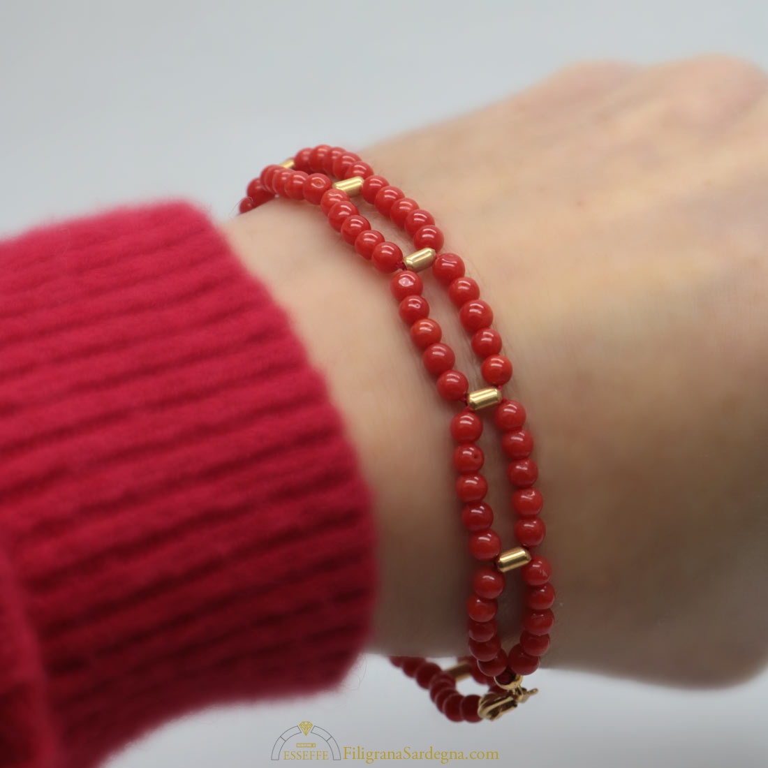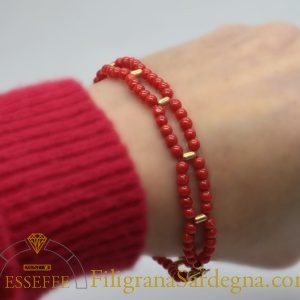 Bracciale con piccole sfere di corallo rosso di Sardegna e intercalari d’oro giallo a forma di piccoli cilindri.