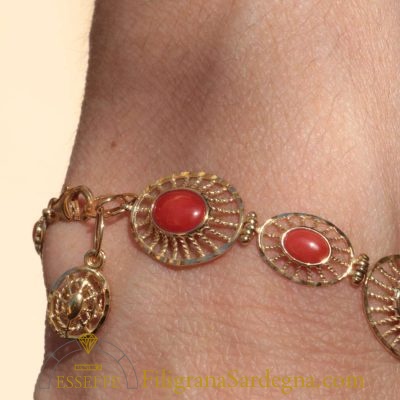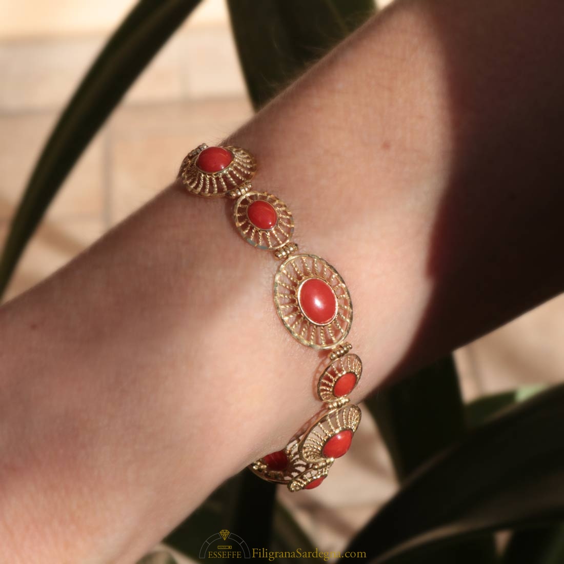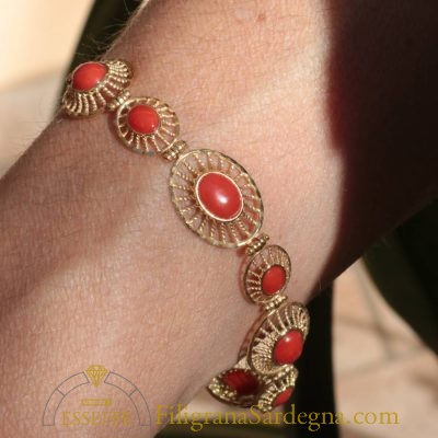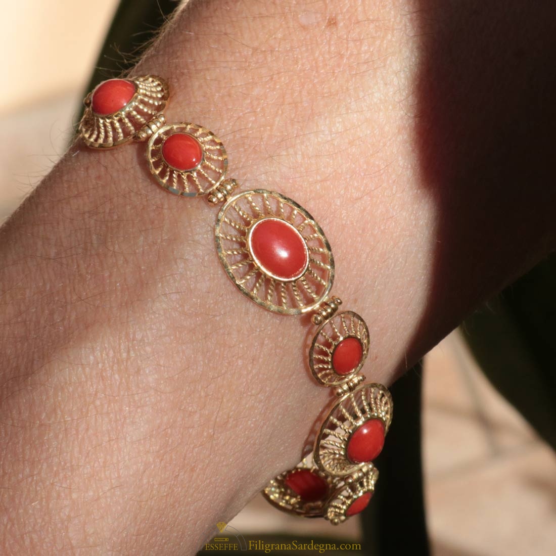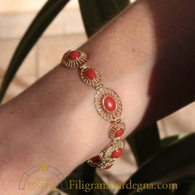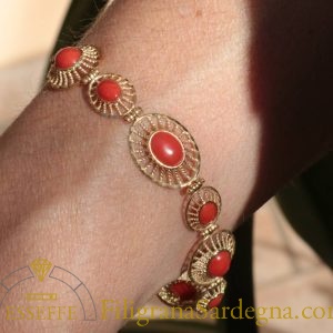 Meraviglioso bracciale con elementi in oro filigranato a gabbia e cabochon di corallo rosso di Sardegna.