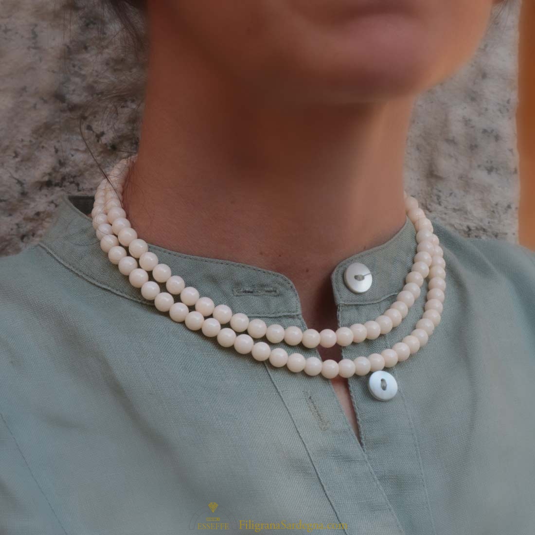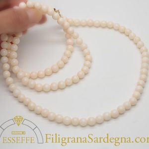 Collana di corallo rosa dalla tonalità molto chiara, con sfere da 7 mm e terminali con chiusura in oro.