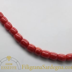 Collana in corallo rosso Sardegna tonalità sangue di bue, taglio barilotto, seconda scelta, chiusura in oro giallo.