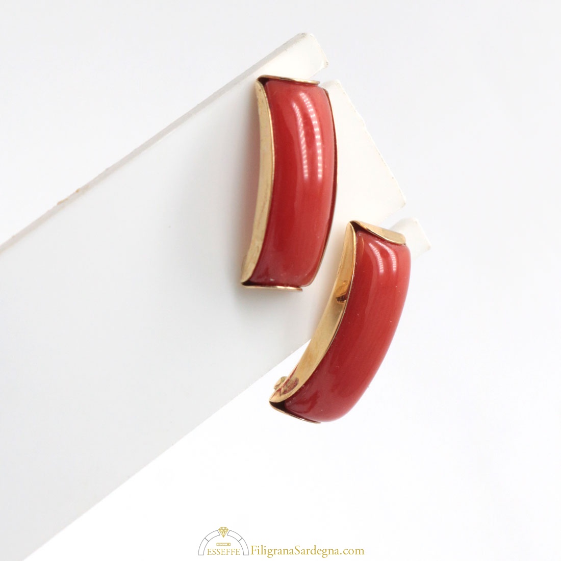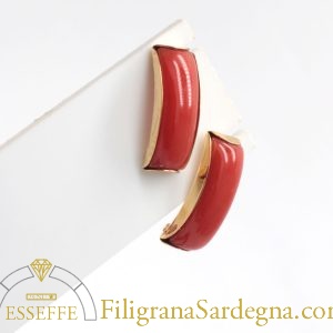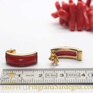 Orecchini a lobo in oro giallo con archetto di corallo rosso di Sardegna. Realizzati interamente a mano.