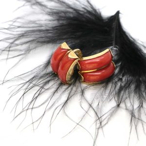 Orecchini a lobo con doppio arco di corallo rosso di Sardegna e montatura d’oro, molto eleganti.