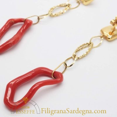 Orecchini in oro con parte pendente costituita da maglie d’oro lavorate e lisce che sostengono un anello irregolare di corallo rosso Sardegna.