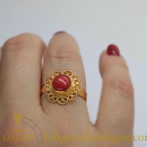 Anello in oro con corallo rosso Sardegna a cabochon tondo, decorato da filigrana e traforo, gambo filigranato.