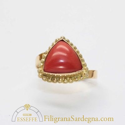 Anello in oro e corallo rosso Sardegna a cabochon con particolare forma a delta, il castone ha un bordo lucido impreziosito da canottigli in filigrana su cui si posano delle piccole sfere d’oro.