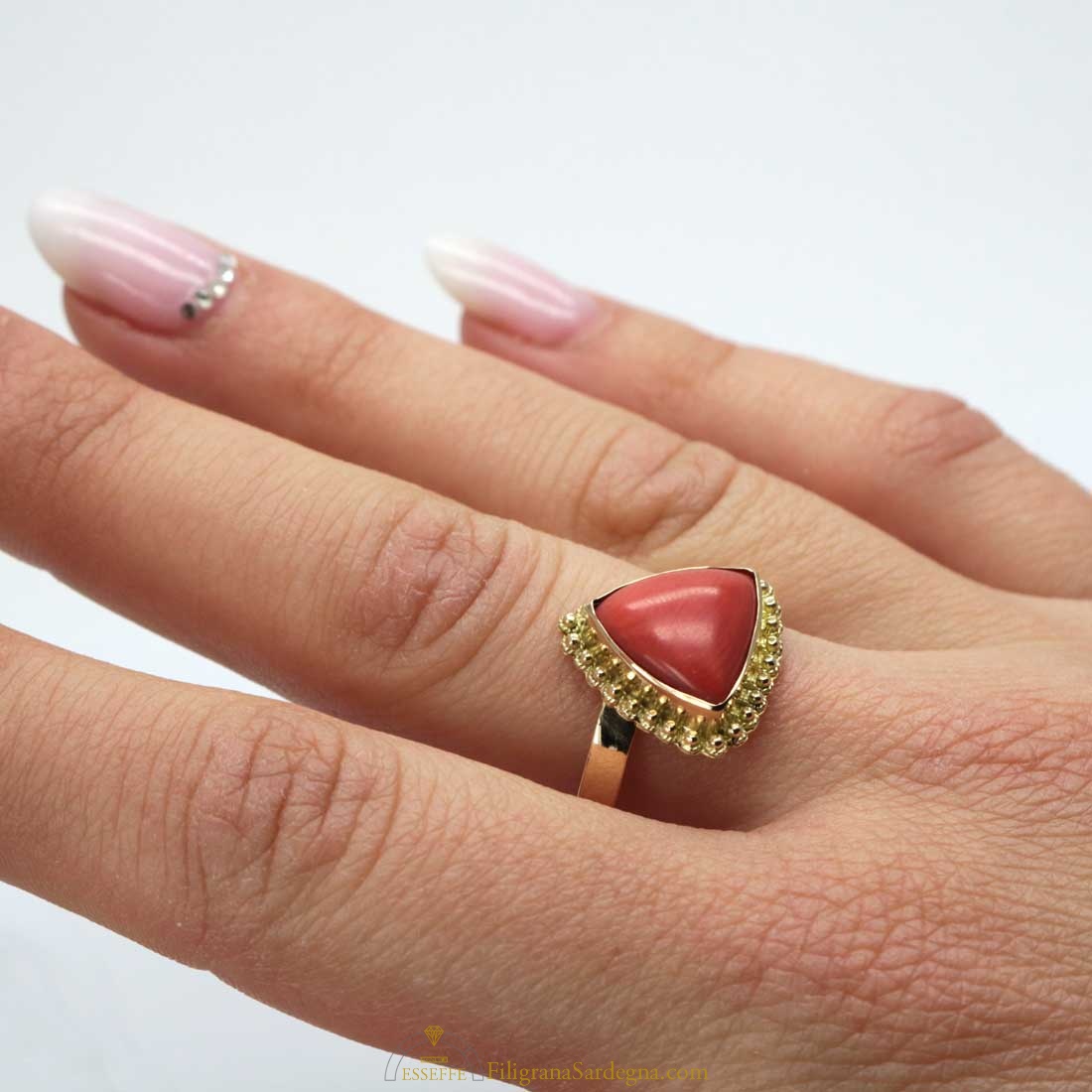 Anello delta di corallo rosso e filigrana d’oro