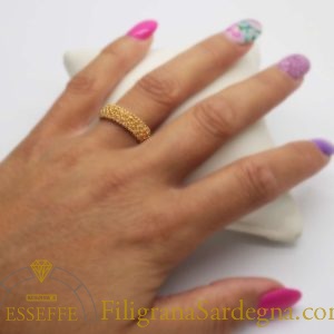 Fede sarda in filigrana d’oro con lavorazione a nido d’ape costituita da ragnetti e grani e microsfere che decorano i bordi dell’anello.