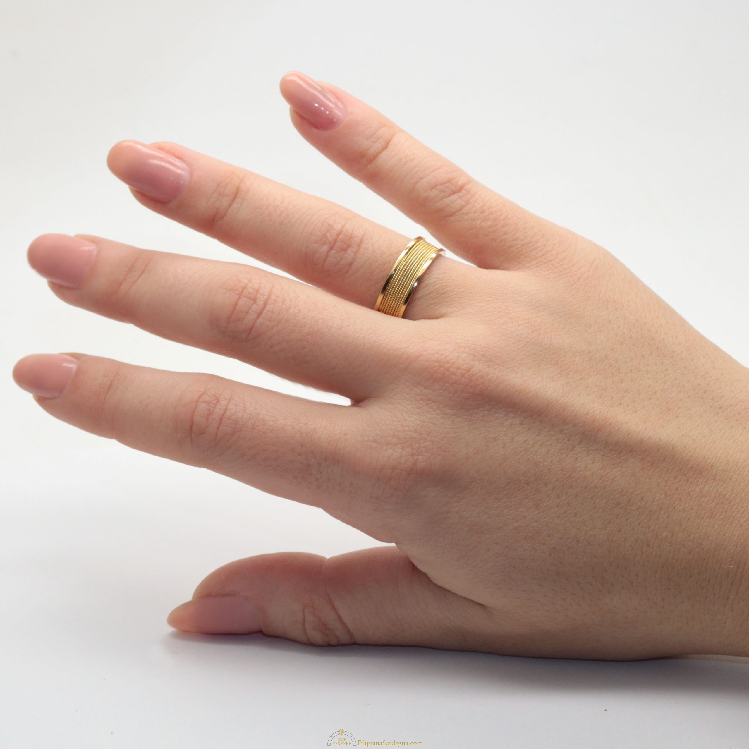 Categoria: anello a fascia in filigrana d’oro Lega: oro 750 Lavorazione: filigrana e nido d’ape Peso: 4 gr circa per la misura 12 (il peso varia a seconda della misura dell'anello) Altezza fascia: 6,5 mm circa Contattateci al 3472444346 anche su Whatsapp  per info sulle misure non presenti.