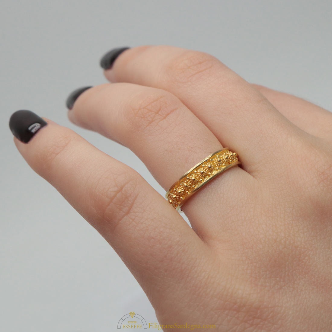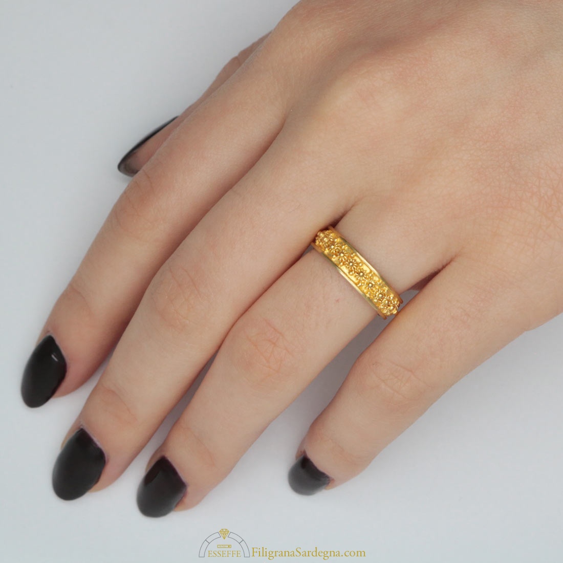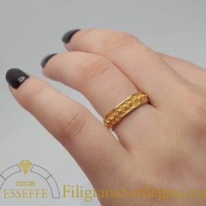 Anello fede sarda in oro con lavorazione a una fila di nido d’ape, costituita dai classici ragnetti e sfere, ma con la particolarità del bordino lucido. Anello unisex strutturato adatto anche come fede nuziale.