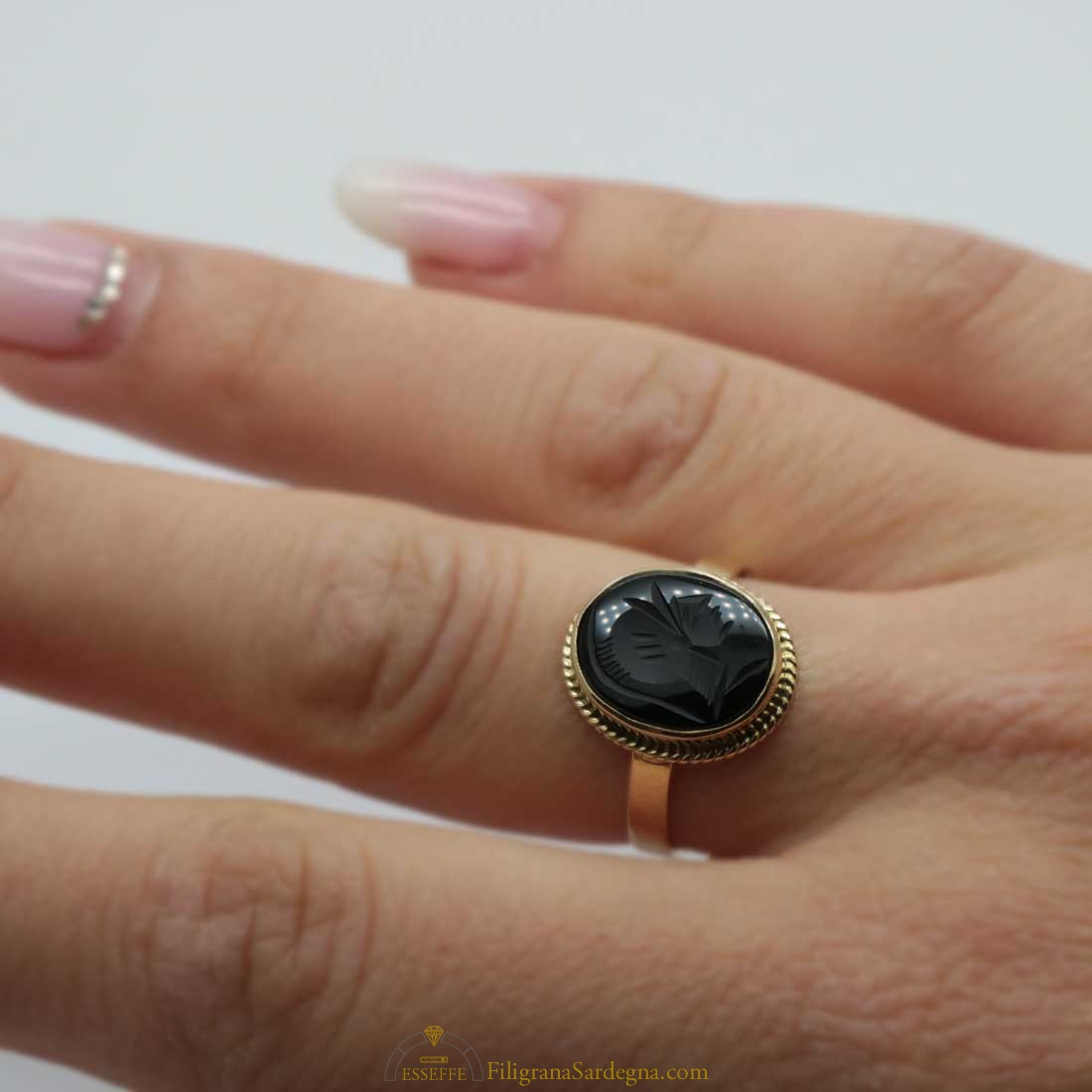Anello in oro con agata nera (corniola), con testa di guerriero incisa e castone con bordo decorato da filigrana d’oro.