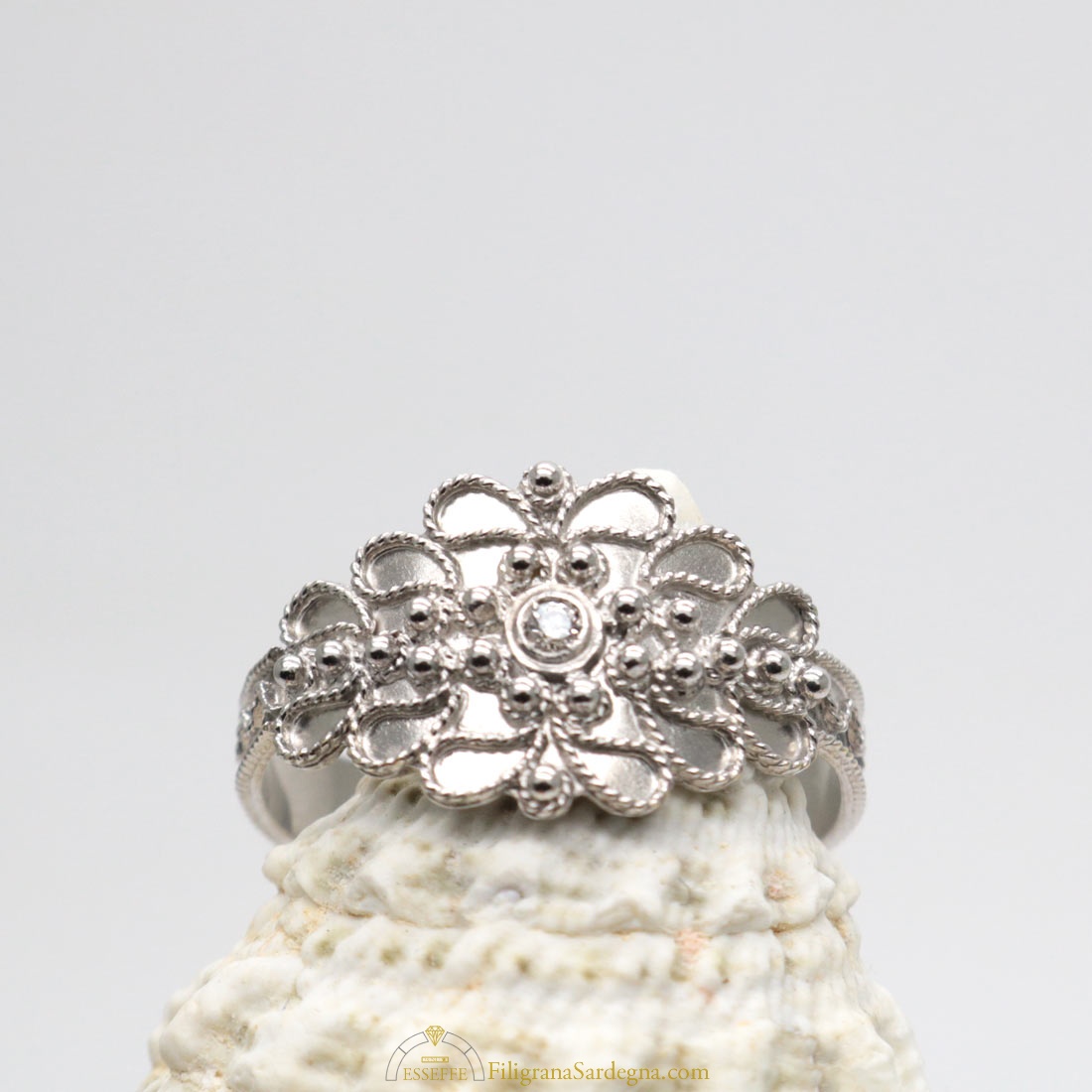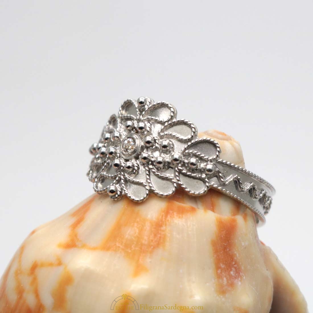 Anello in filigrana d’oro con diamantino da 0,02 ct incastonato al centro della decorazione a foglioline e grani tipica del modello di fede sarda campidanese.