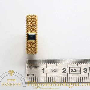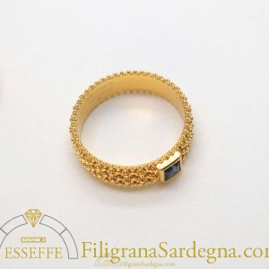 Anello fede sarda in oro 18 kt, a due file di lavorazione a nido d’ape su tutto il gambo dell’anello, realizzata con un nido d’ape slim: il disegno è più fine e delicato, l’anello è impreziosito da uno zaffiro dal taglio quadrato.