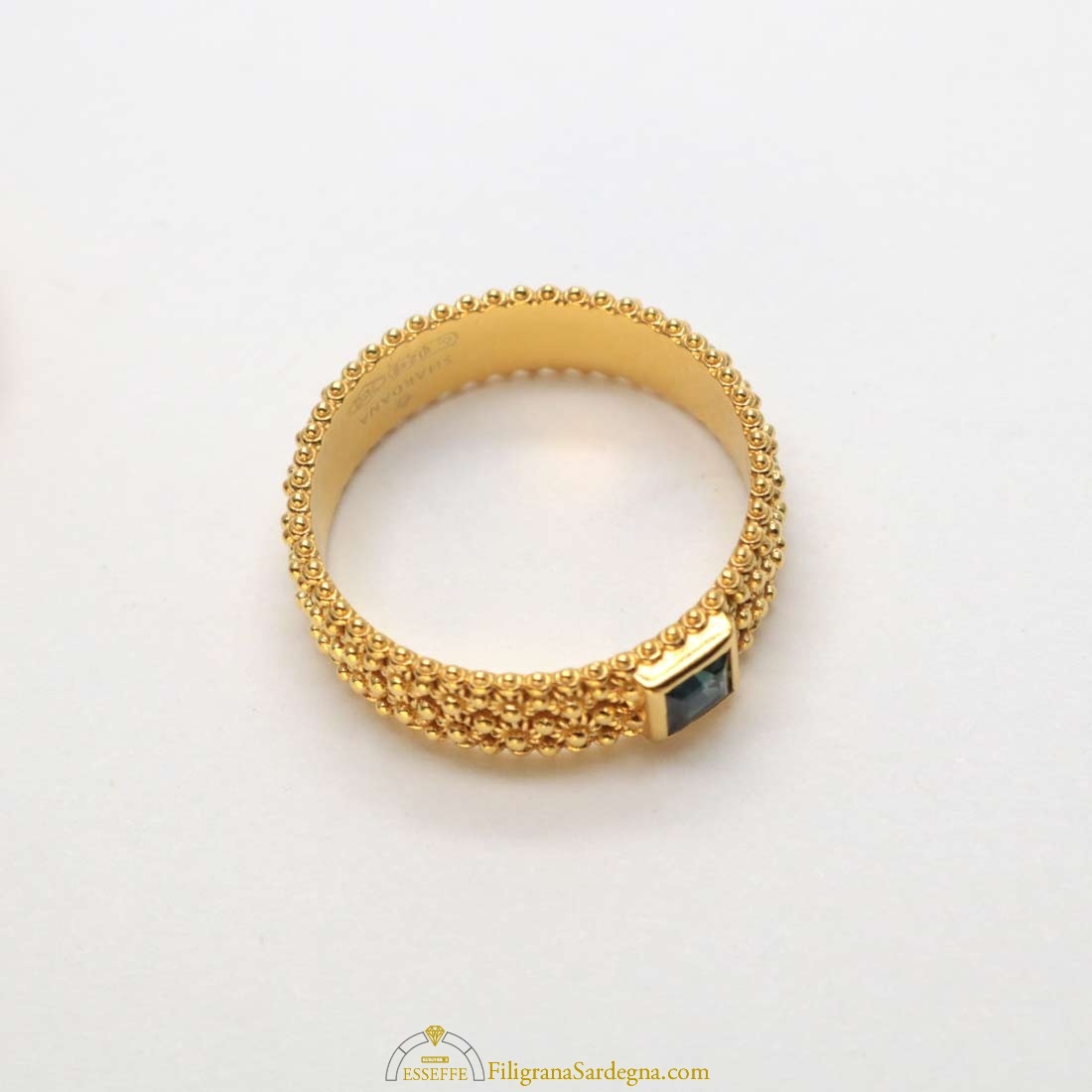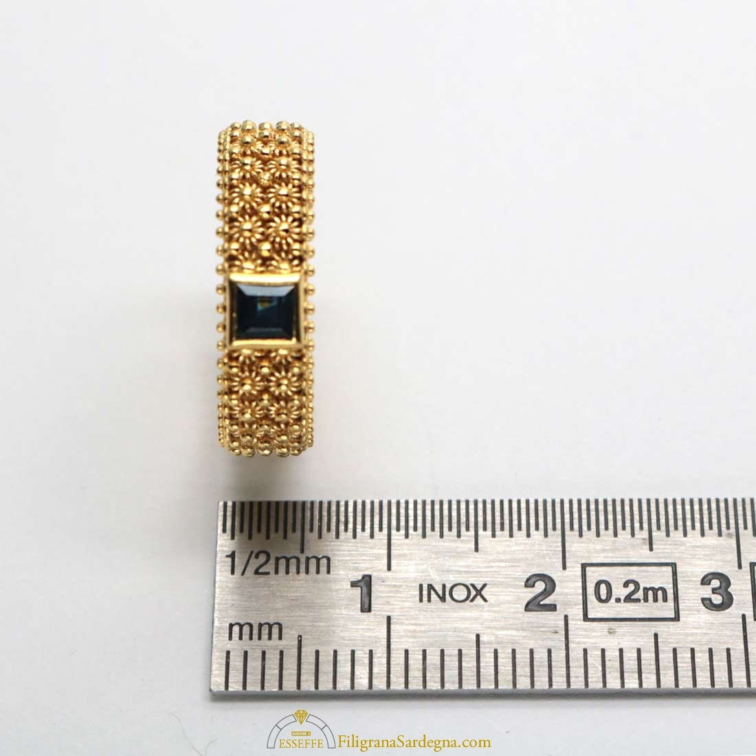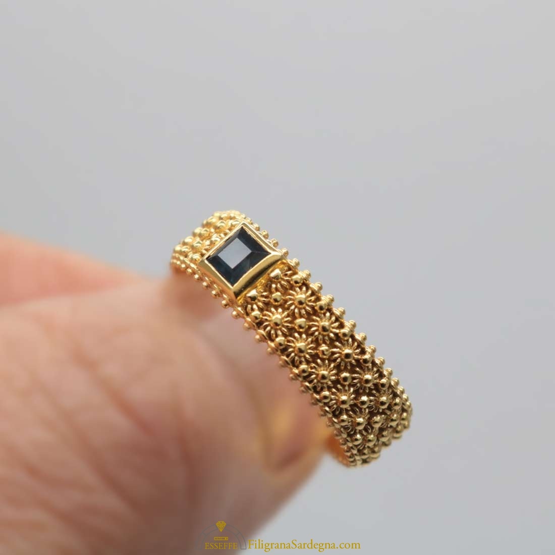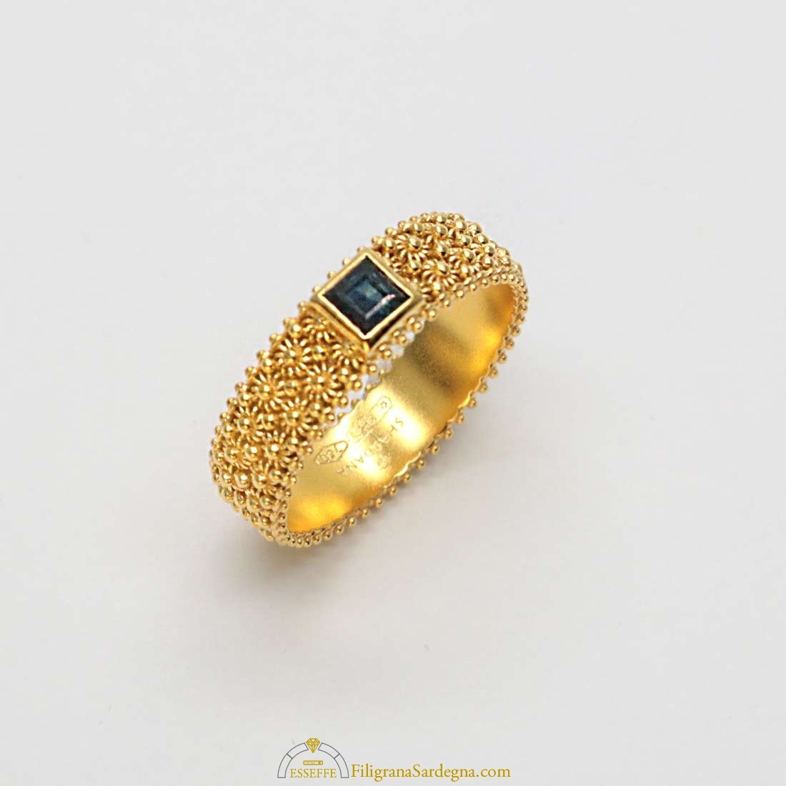 Anello fede sarda in oro 18 kt, a due file di lavorazione a nido d’ape su tutto il gambo dell’anello, realizzata con un nido d’ape slim: il disegno è più fine e delicato, l’anello è impreziosito da uno zaffiro dal taglio quadrato.