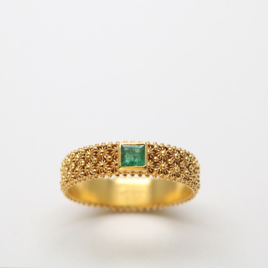 Anello fede sarda in oro 18 kt, a due file di lavorazione a nido d’ape su tutto il gambo dell’anello, realizzata con un nido d’ape slim: il disegno è più fine e delicato, l’anello è impreziosito da uno smeraldo dal taglio quadrato.