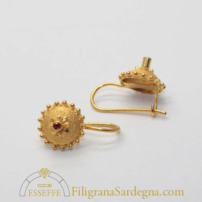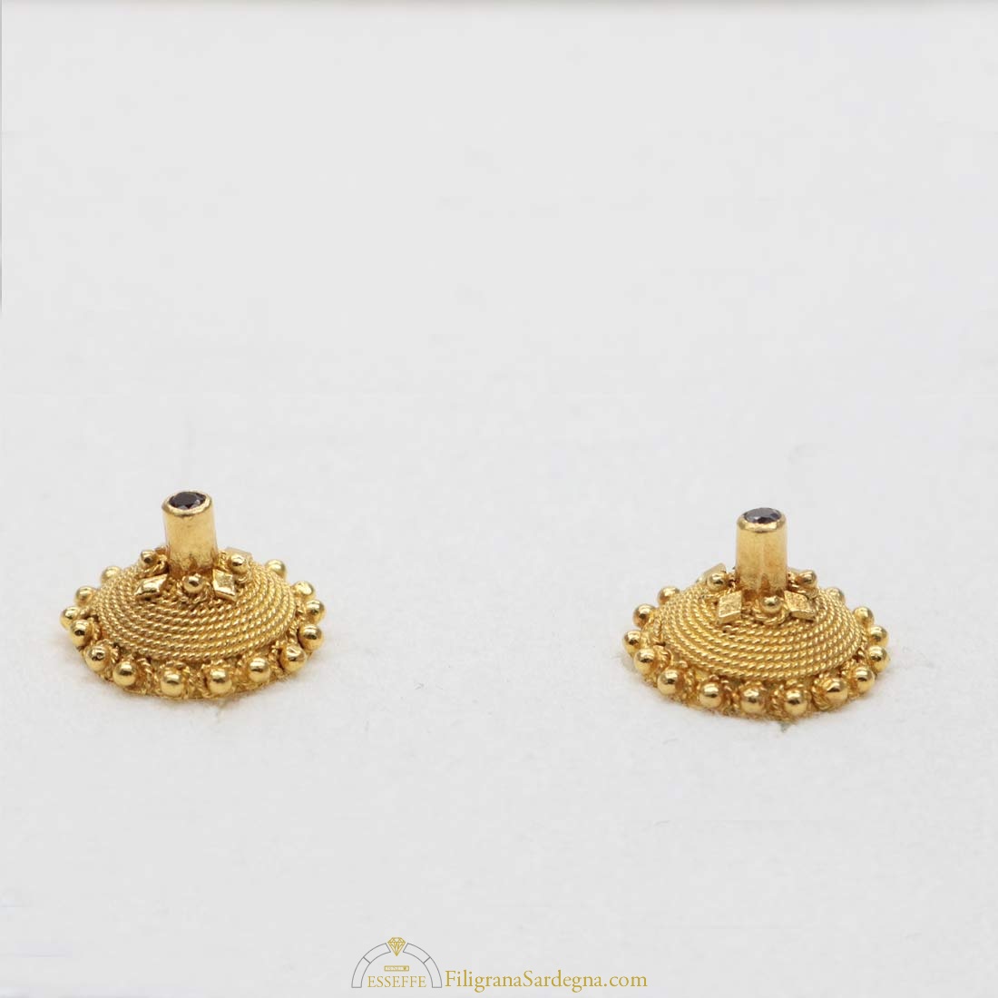 Piccoli orecchini in filigrana d’oro, che riprendono, quasi in una miniatura, il disegno della parte superiore di un bottone sardo.