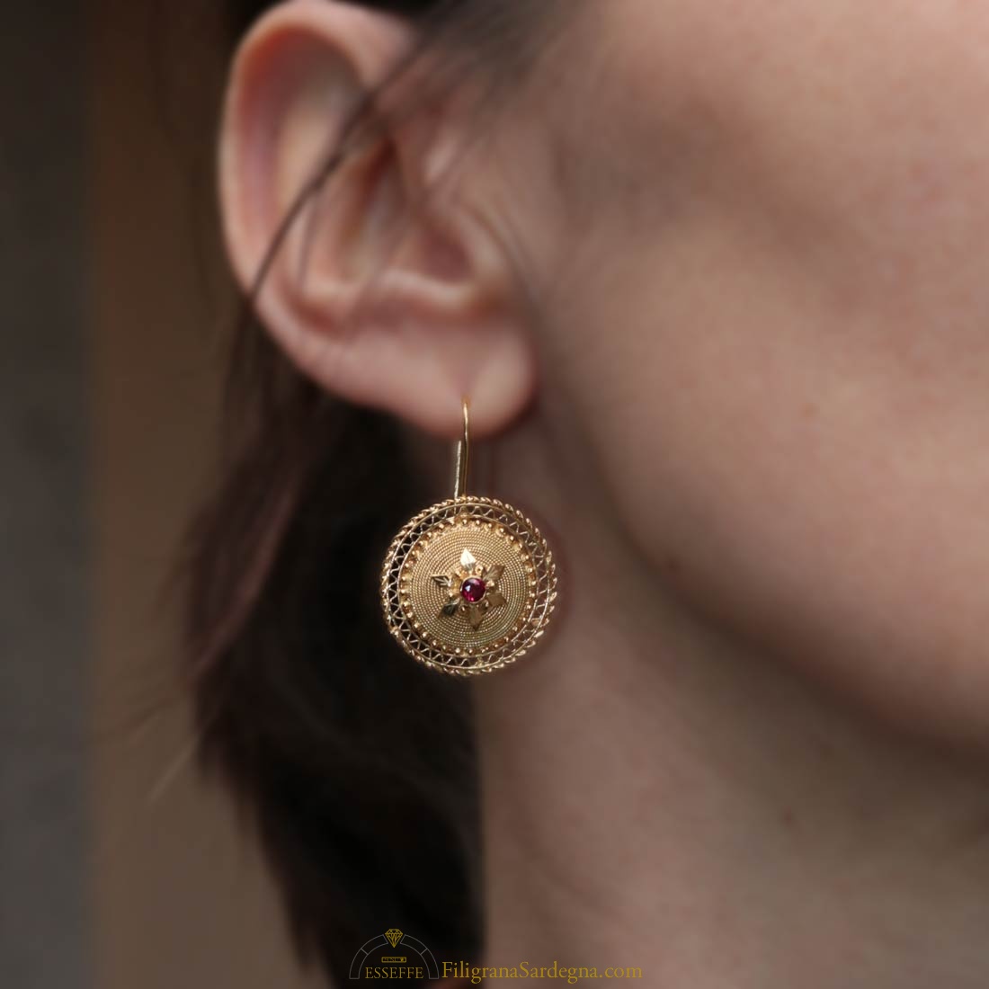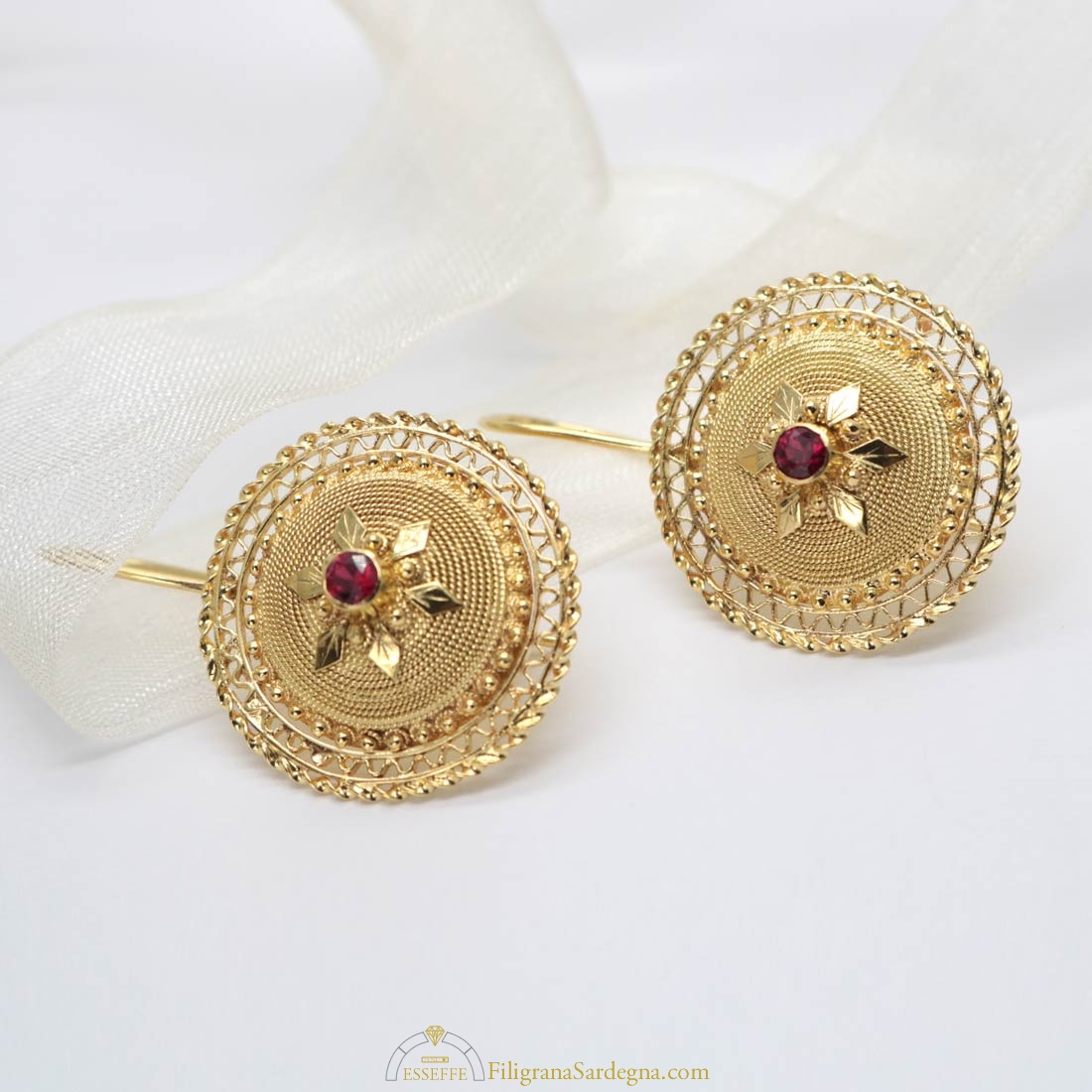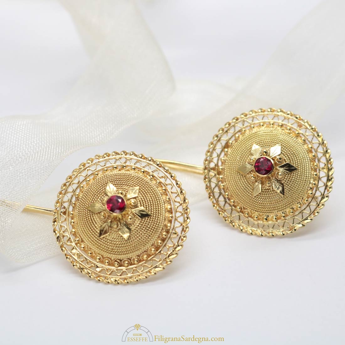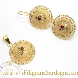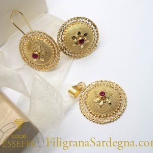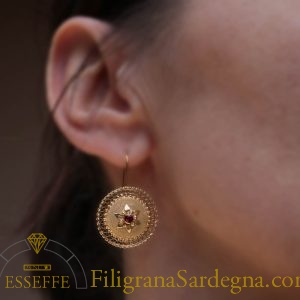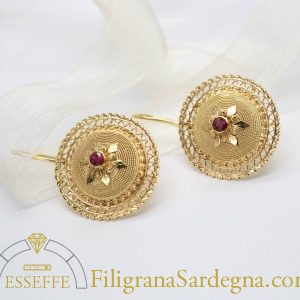 Orecchini in filigrana d’oro che riprendono la parte superiore del bottone sardo tradizionale, e montano rubini da 8 punti ciascuno.