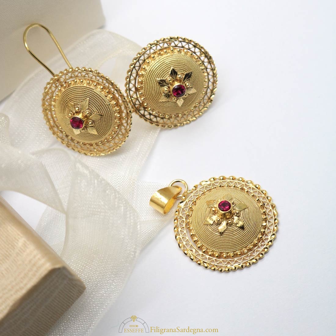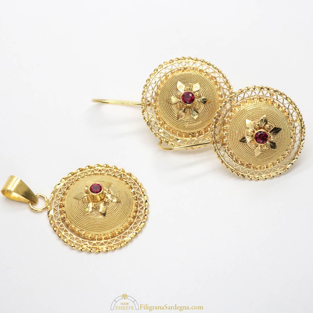Categoria: pendente tradizionale – ciondolo in filigrana Lega: oro 750 Lavorazione: filigrana Peso: 3,3 gr Dimensioni: 2,2 cm di diametro Pietre: rubino da o,08 ct