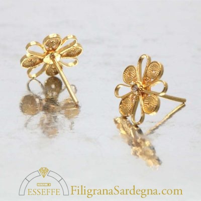 Orecchini a lobo in filigana d’oro a forma di fiore con petali alternativamente decorati da cartocci di filigrana, al centro un diamantino con castone decorato da un bordino in filigrana.