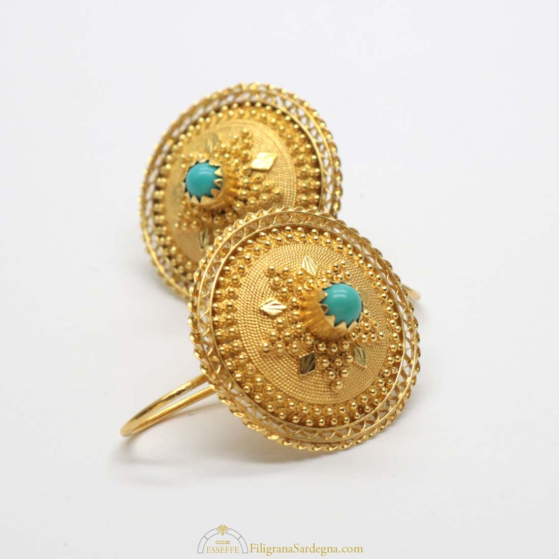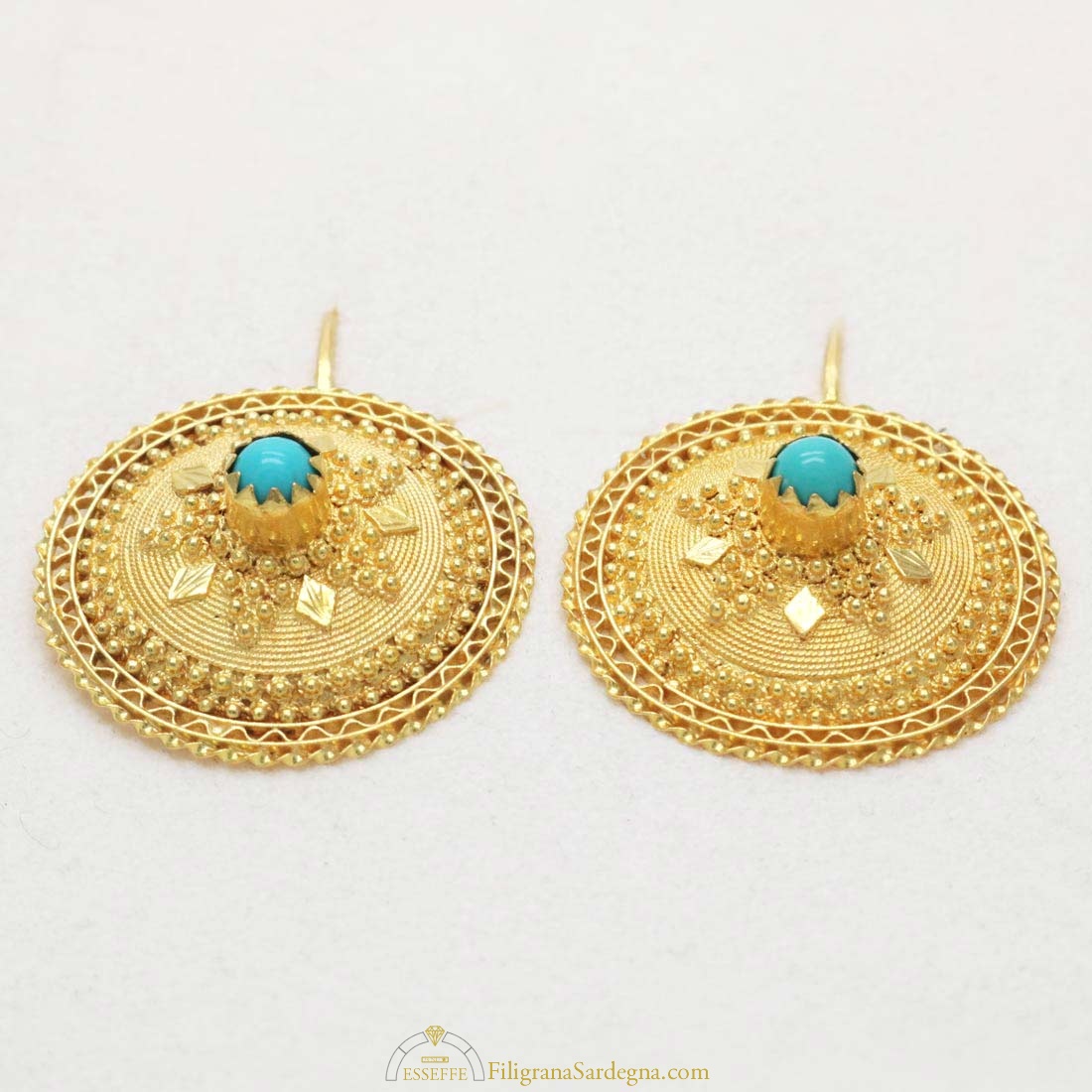 Orecchini in oro che riproducono la parte superiore del bottone in uso nell’abito tradizionale sardo, costituiti da una lastra d’oro a cono rivestita da un sottile filo ritorto (filigrana) sistemato a spirale su cui vengono saldati rombi e granuli a comporre un motivo floreale.