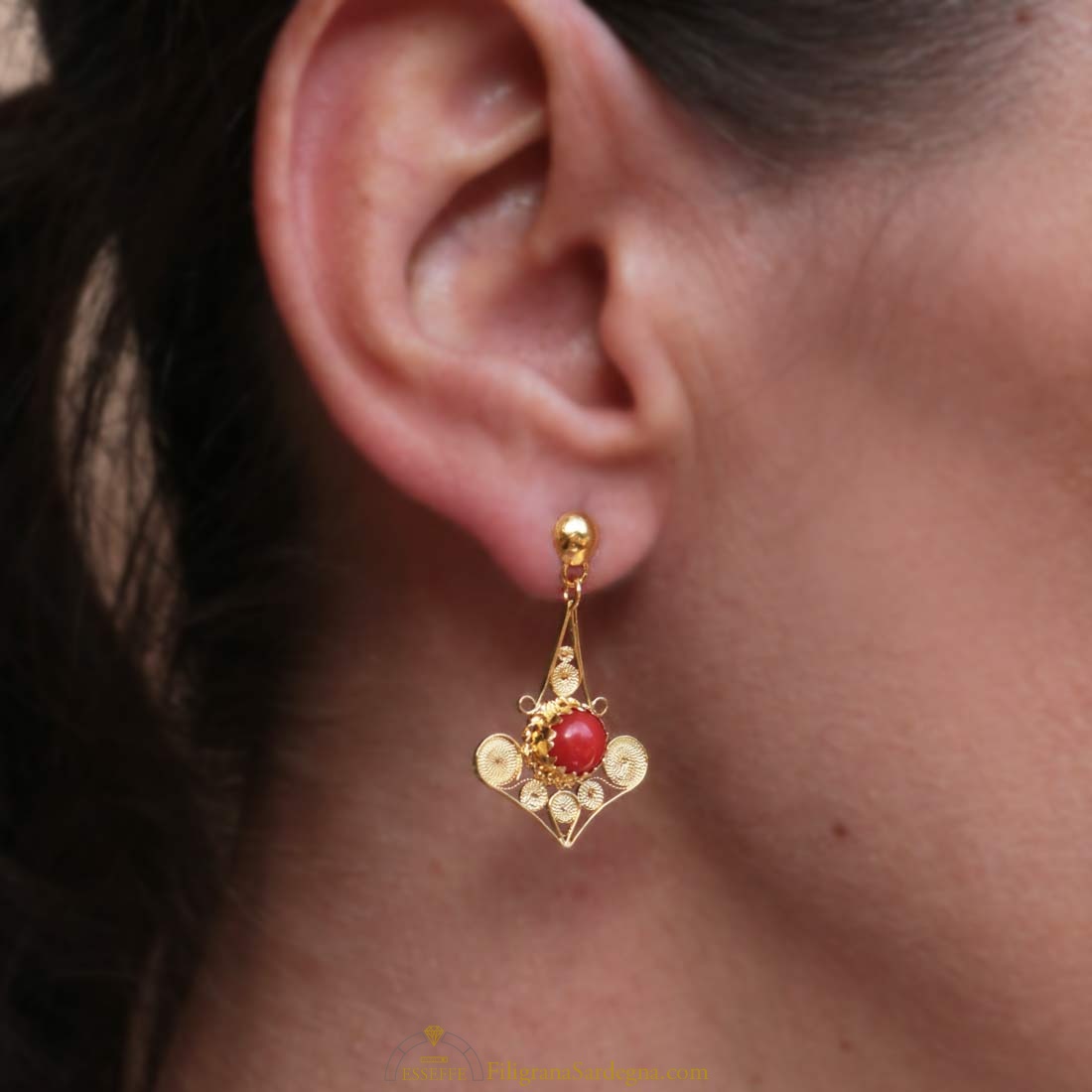 Orecchini pendenti in filigrana d’oro con corallo rosso Sardegna.