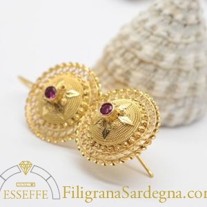 Orecchini in filigrana d’oro che riprendono la parte superiore del bottone usato nell’abito tradizionale sardo.